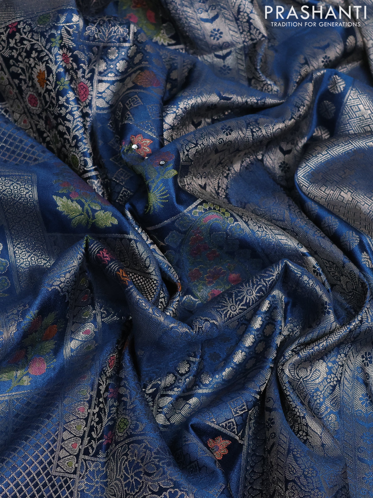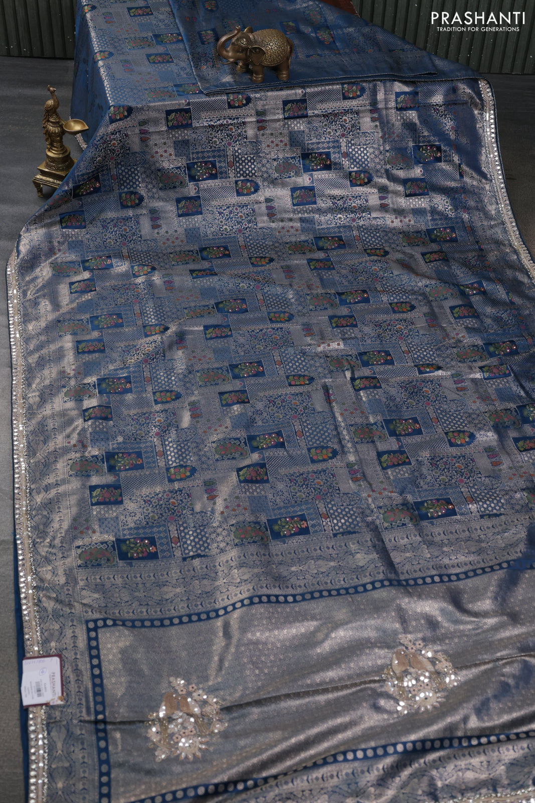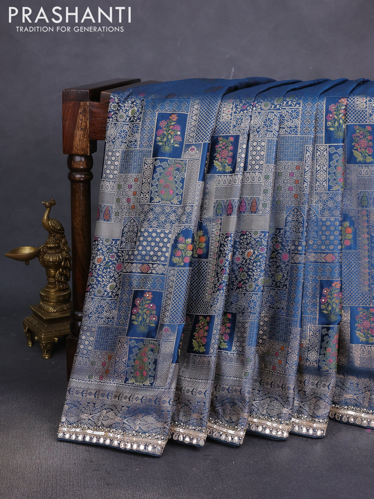 Banarasi silk saree dark peacock blue with allover zari woven brocade weaves and embroidery sequin work border