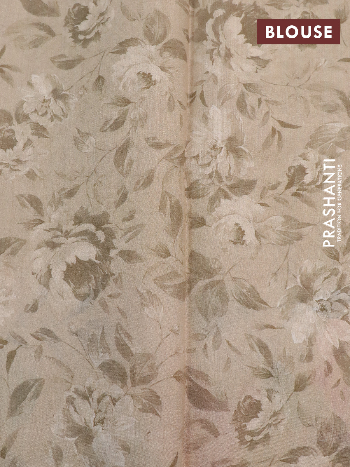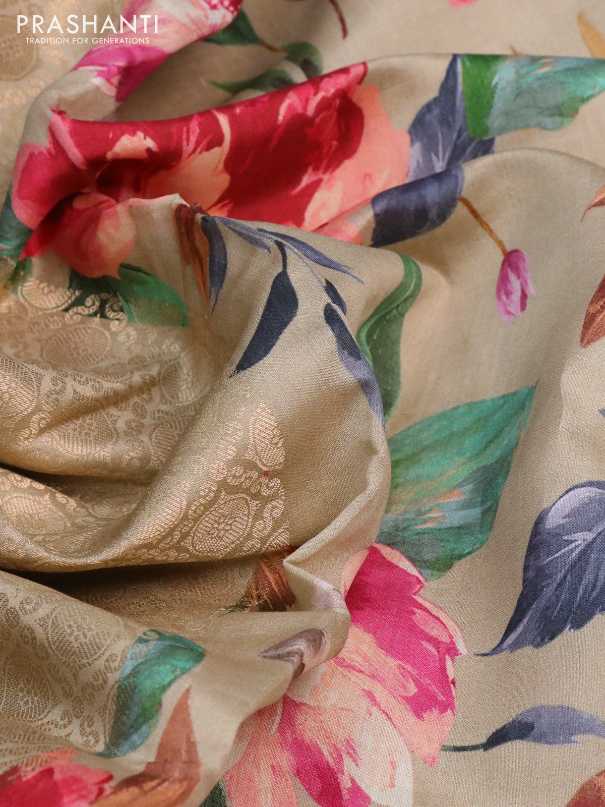 Banarasi silk saree dark sandal with allover zari woven brocade weaves and floral digital printed border