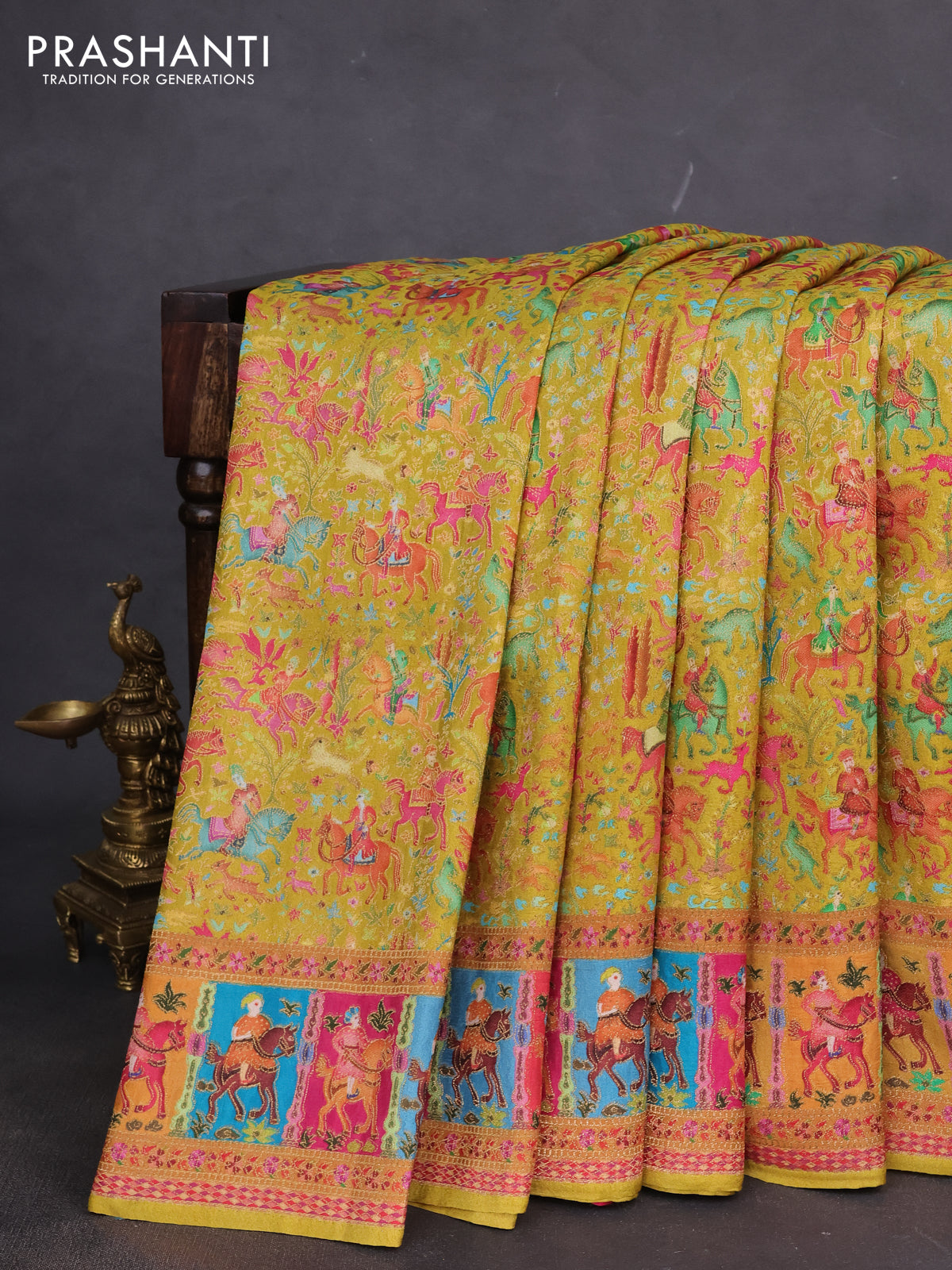 Banarasi silk saree lime green and pink with allover position prints and printed border