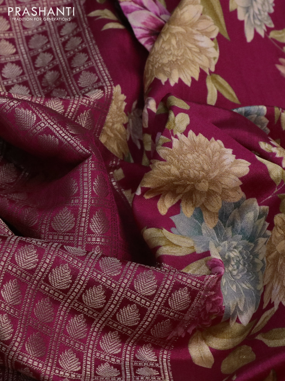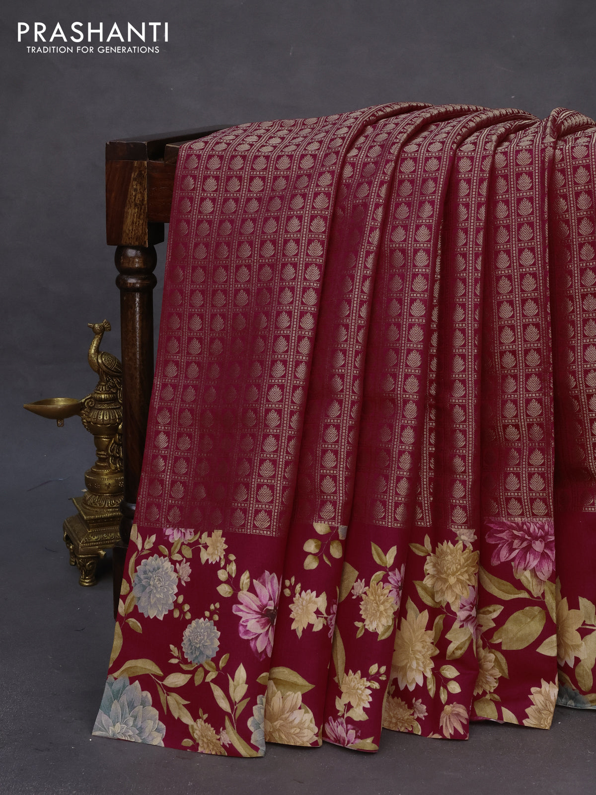 Banarasi silk saree maroon with allover zari woven brocade weaves and floral digital printed border