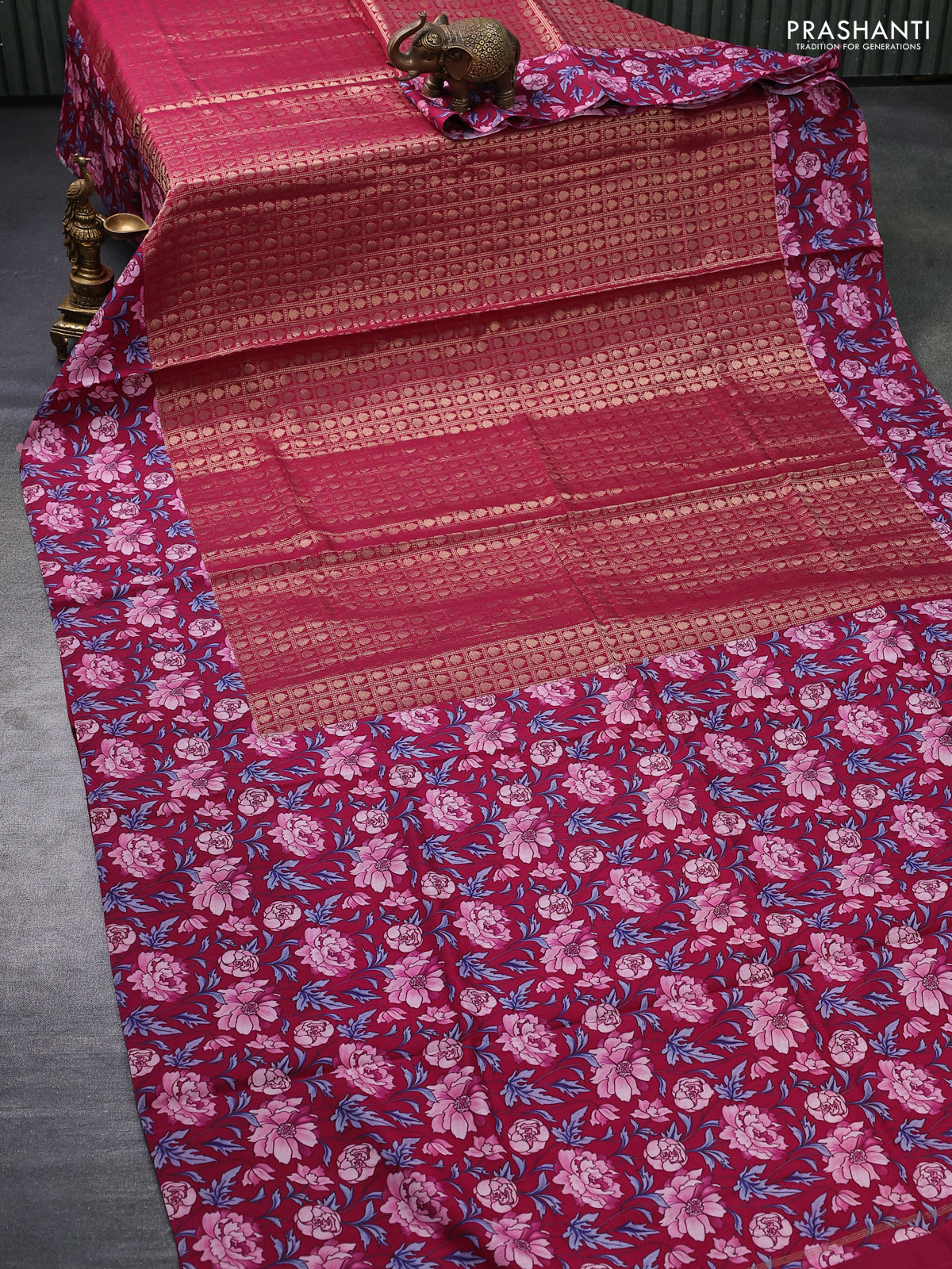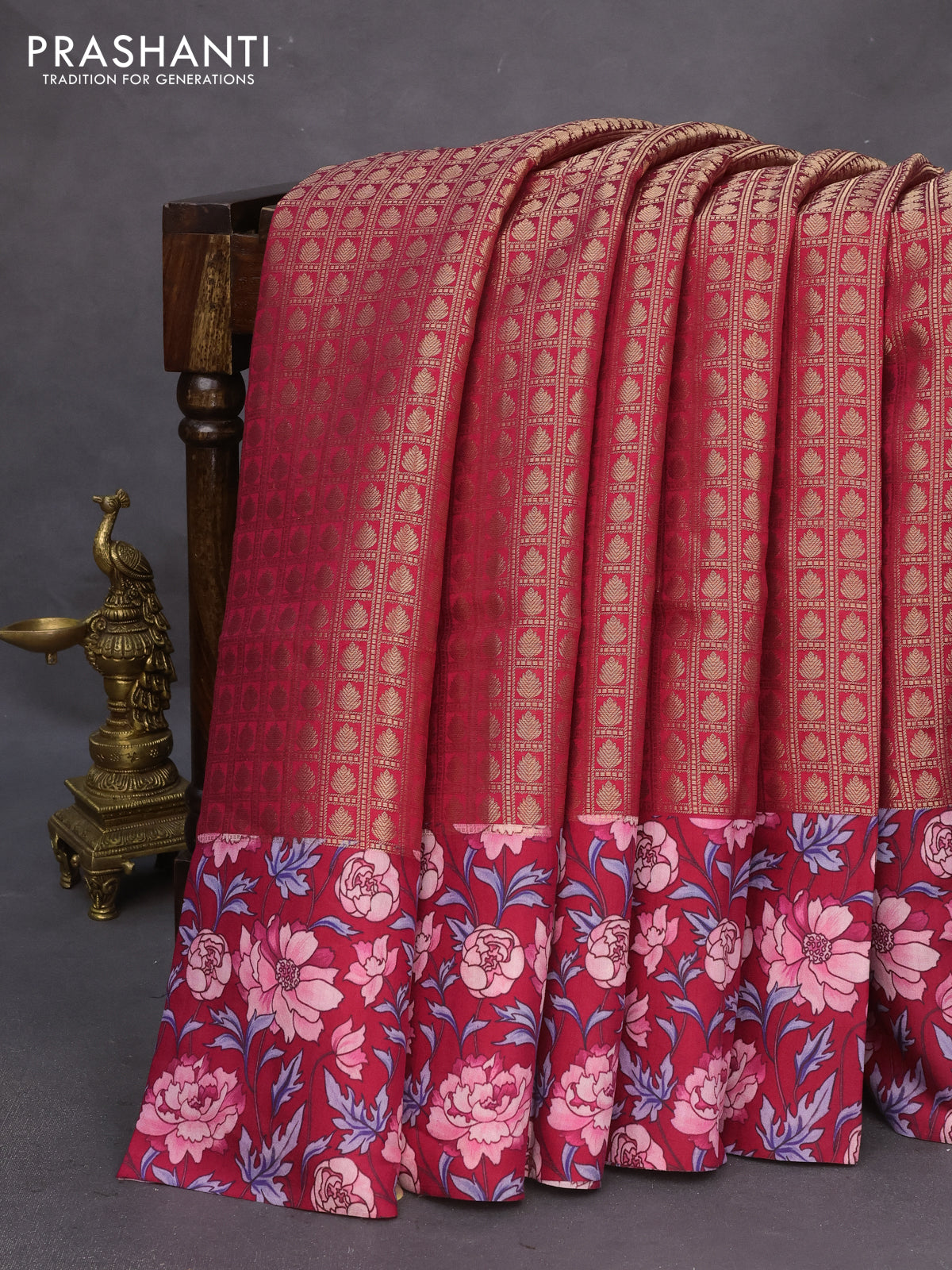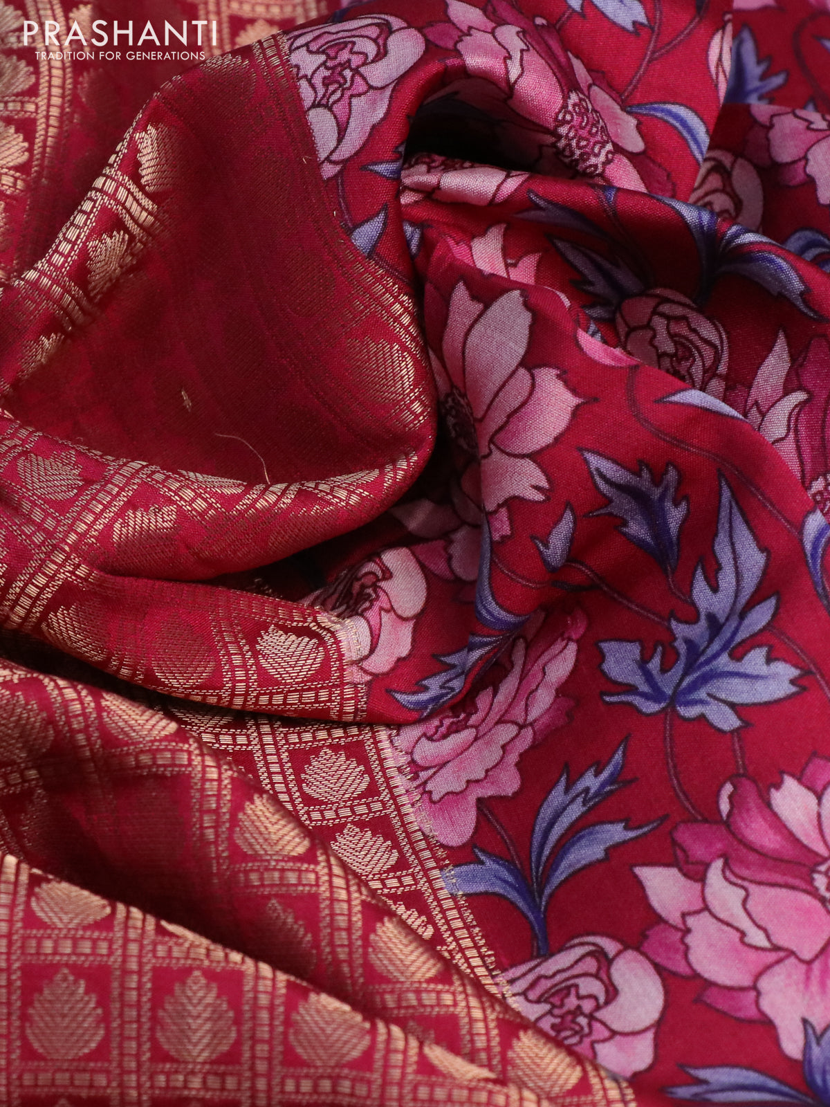Banarasi silk saree maroon with allover zari woven brocade weaves and floral digital printed border