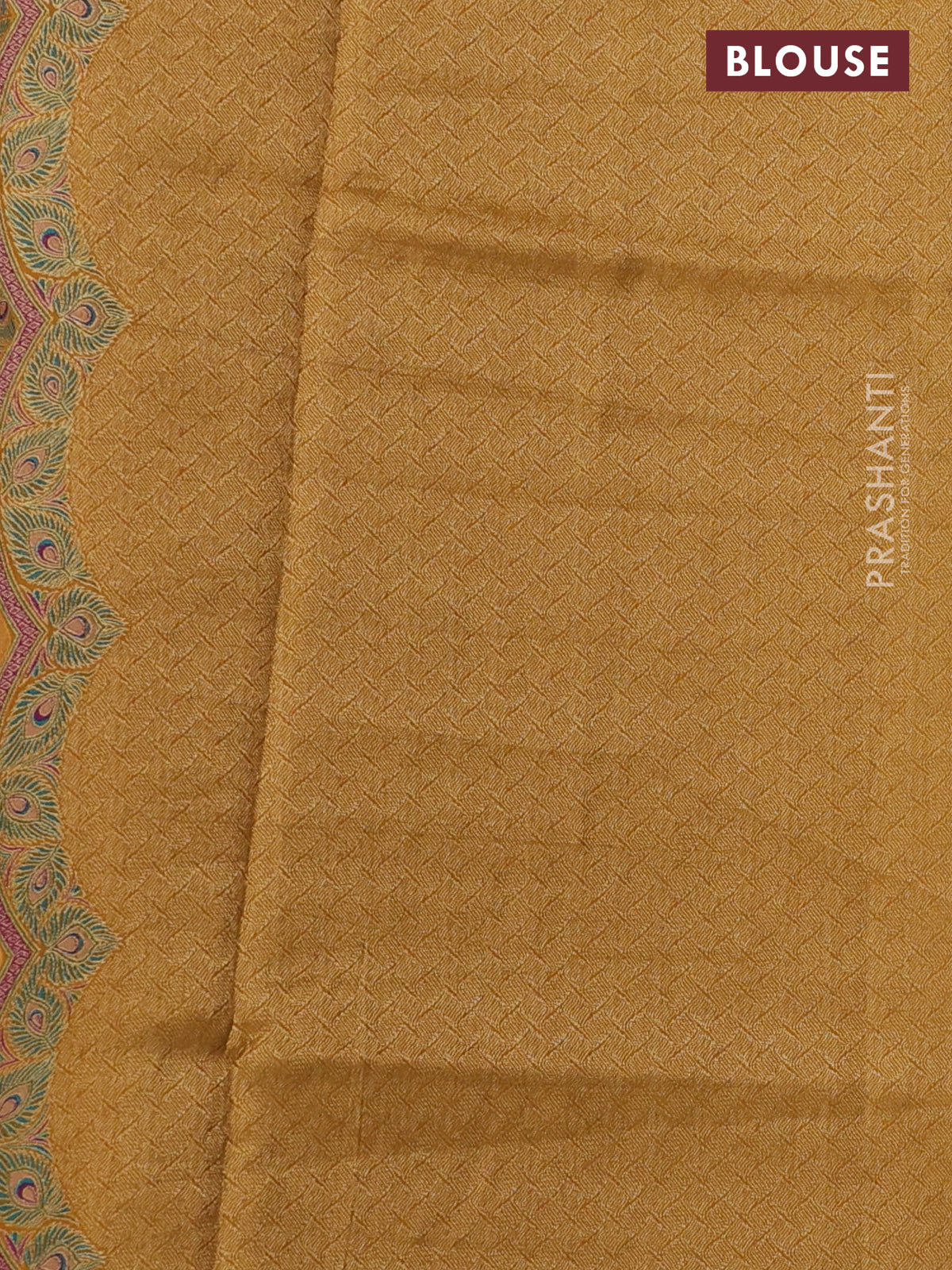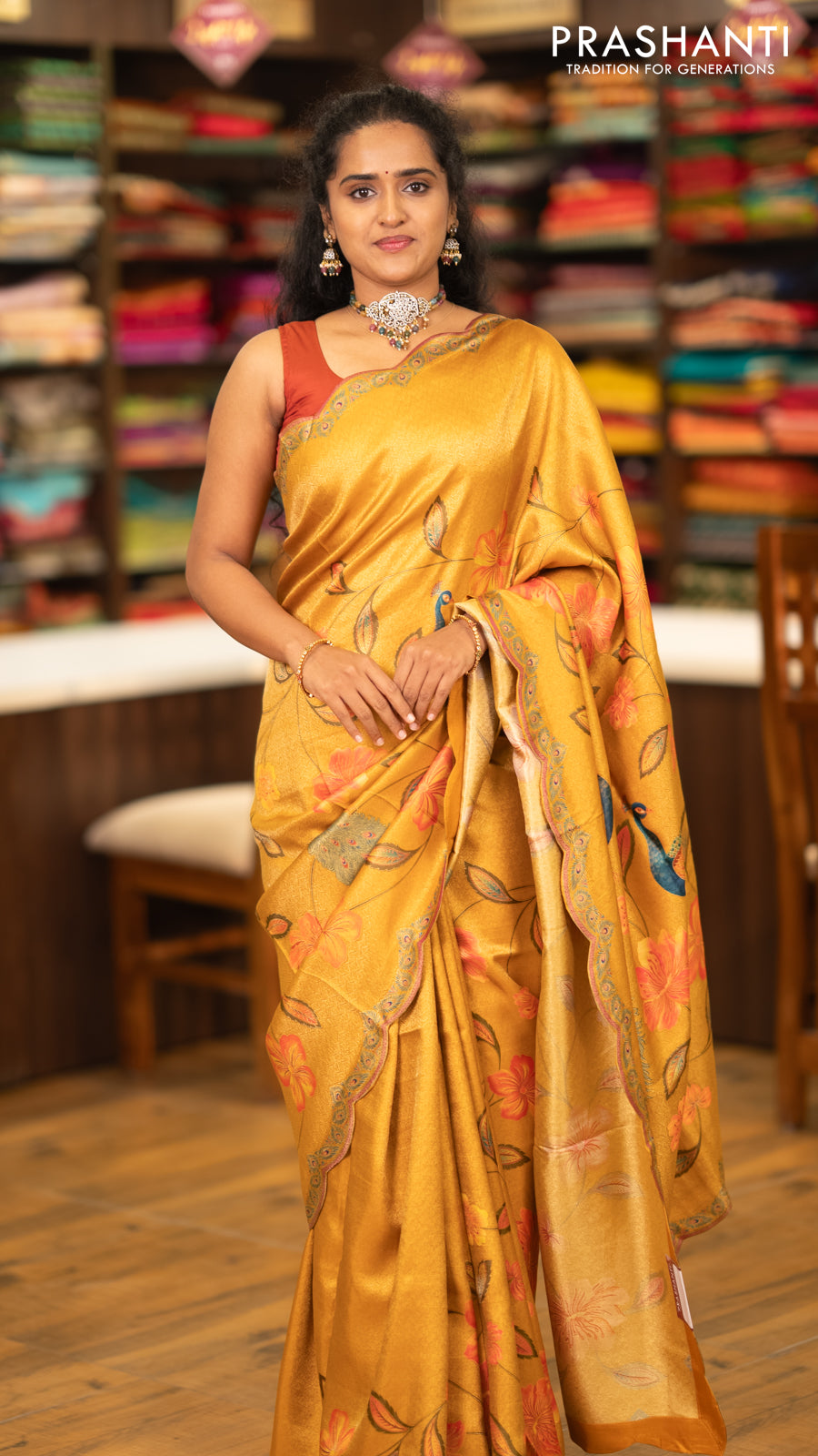 Banarasi silk saree mustard yellow with allover floral prints and scallop design border