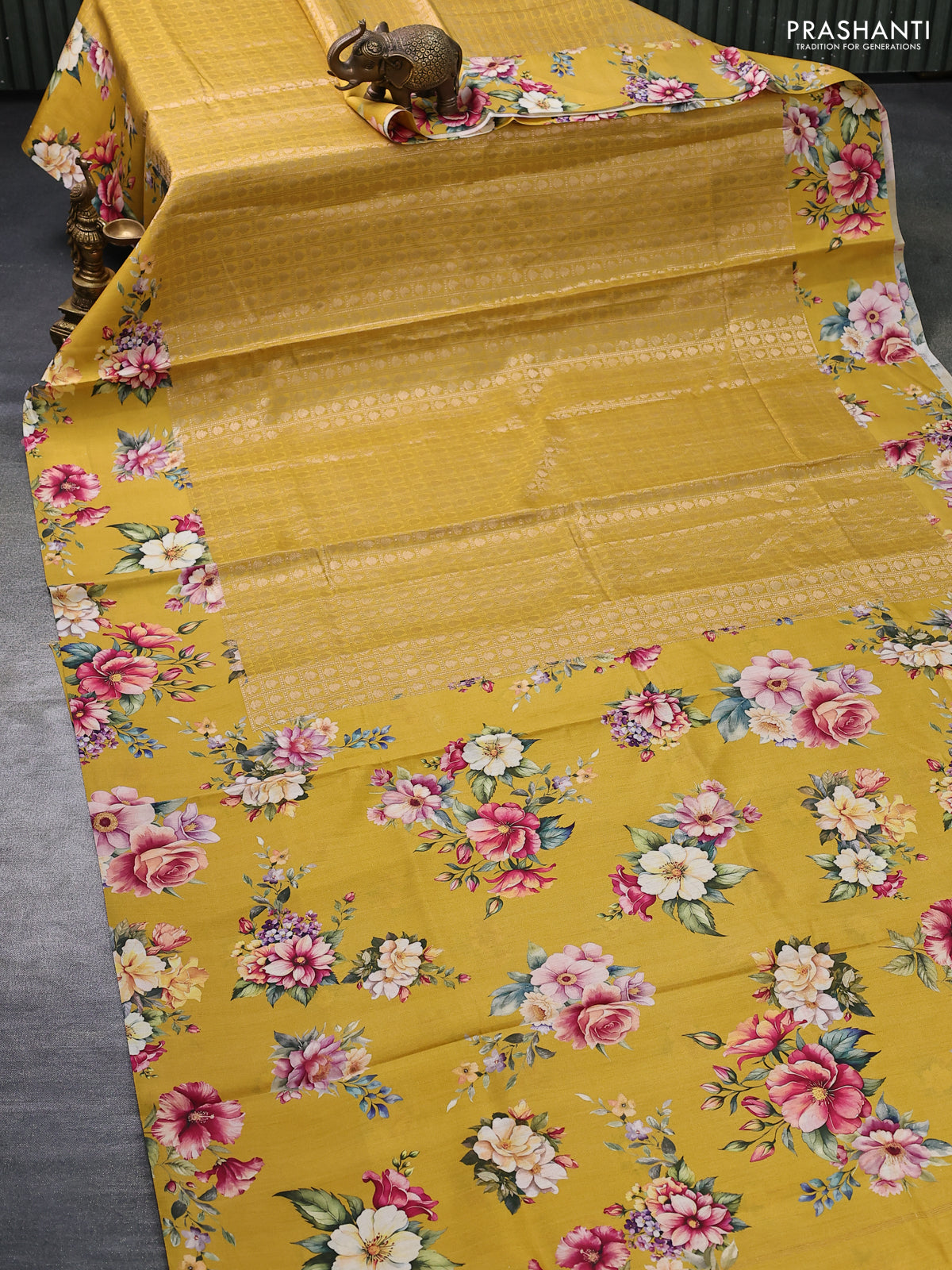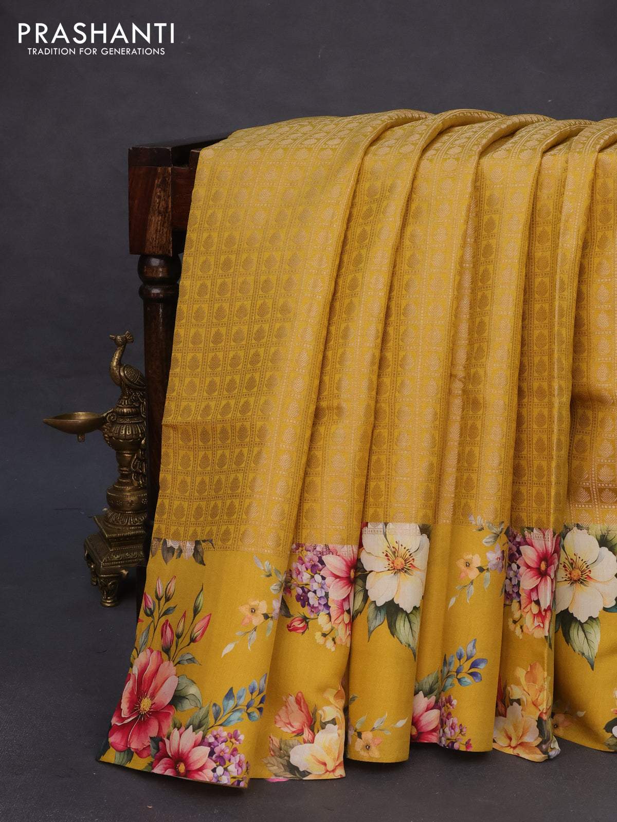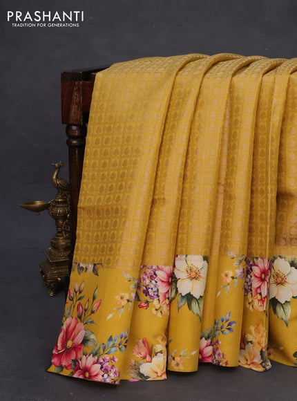 Banarasi silk saree mustard yellow with allover zari woven brocade weaves and floral digital printed border