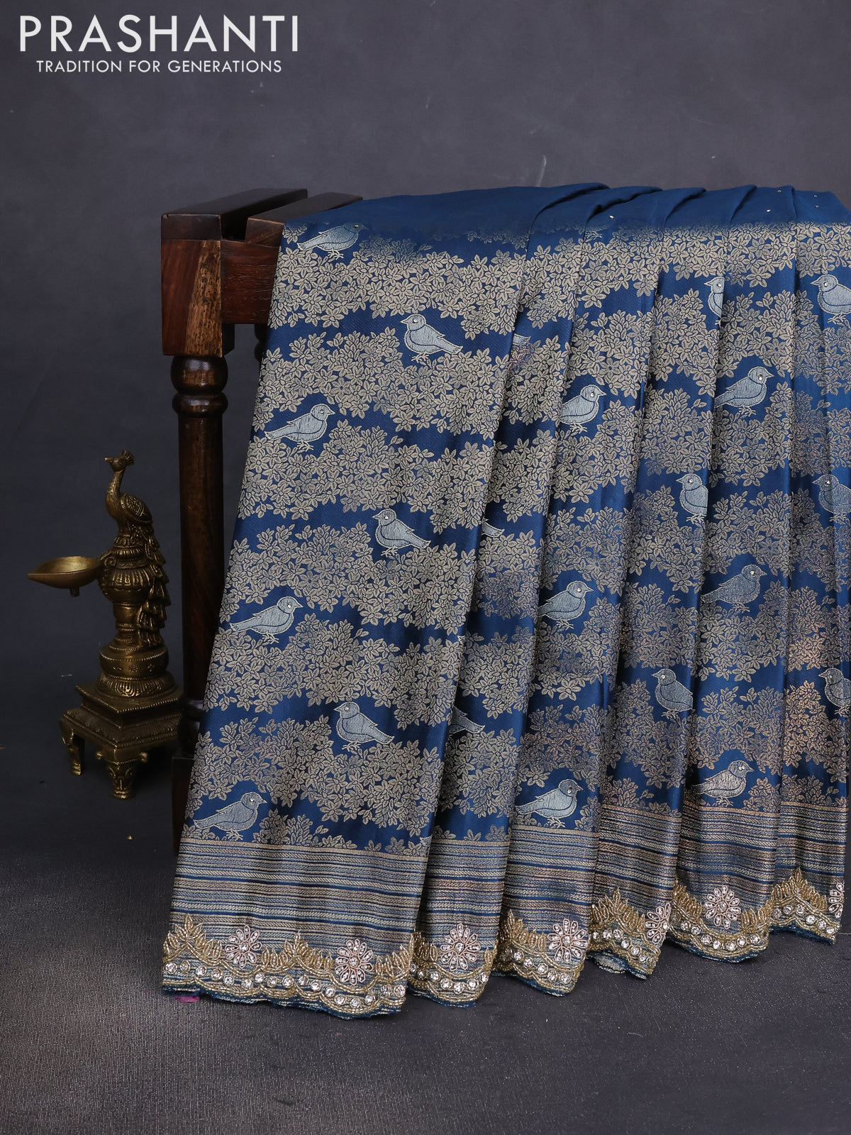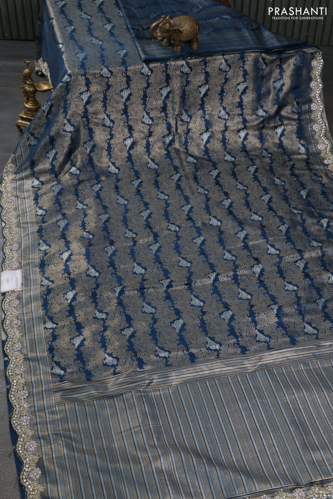 Banarasi silk saree peacock blue with allover zari woven brocade weaves and embroidery mirror work border