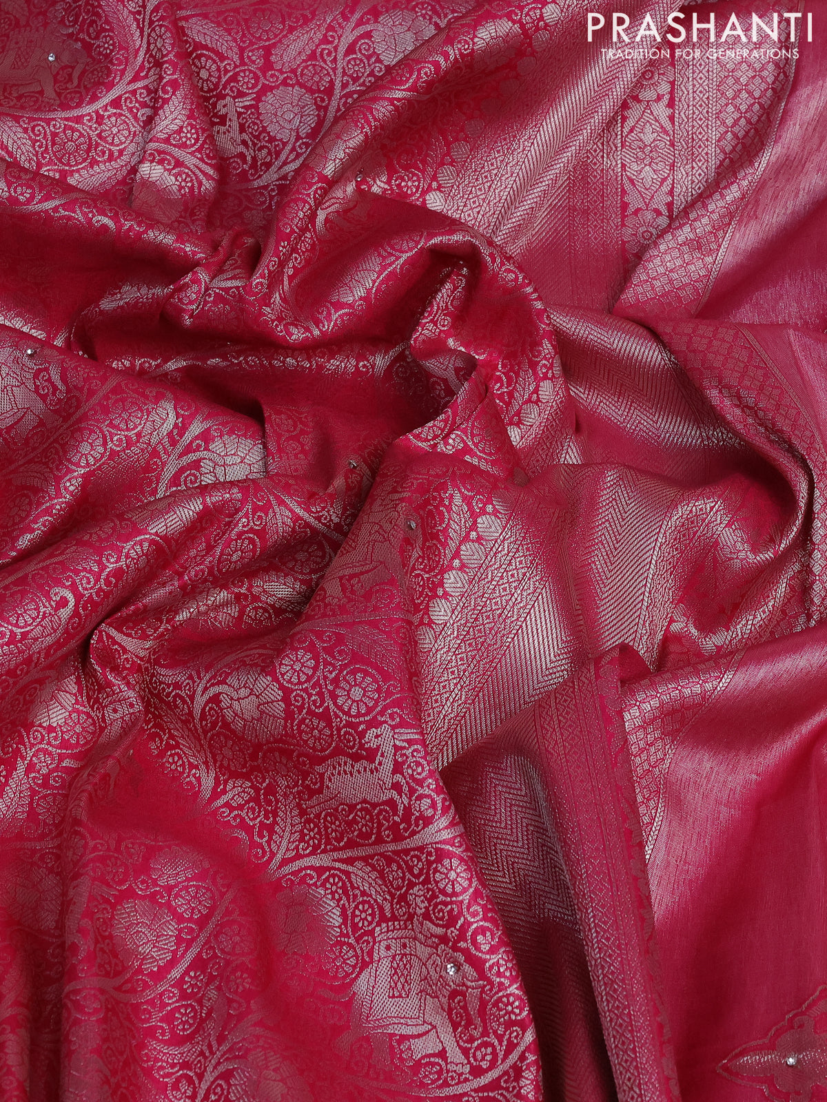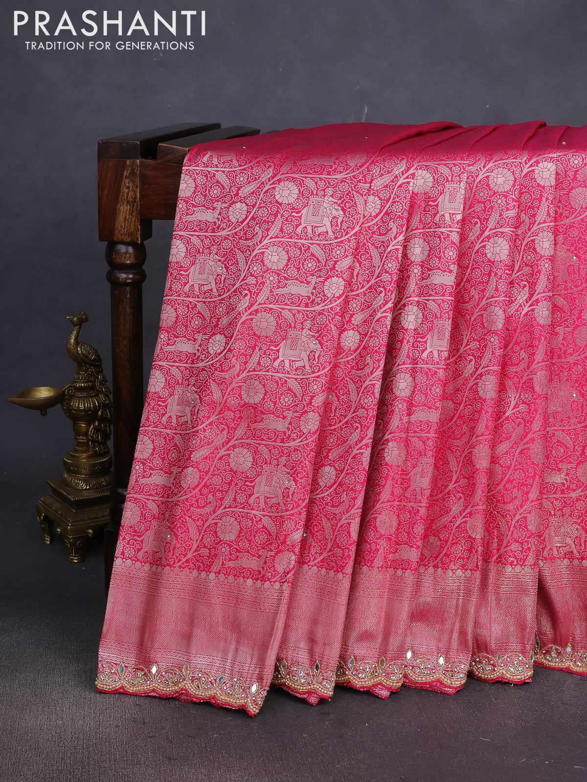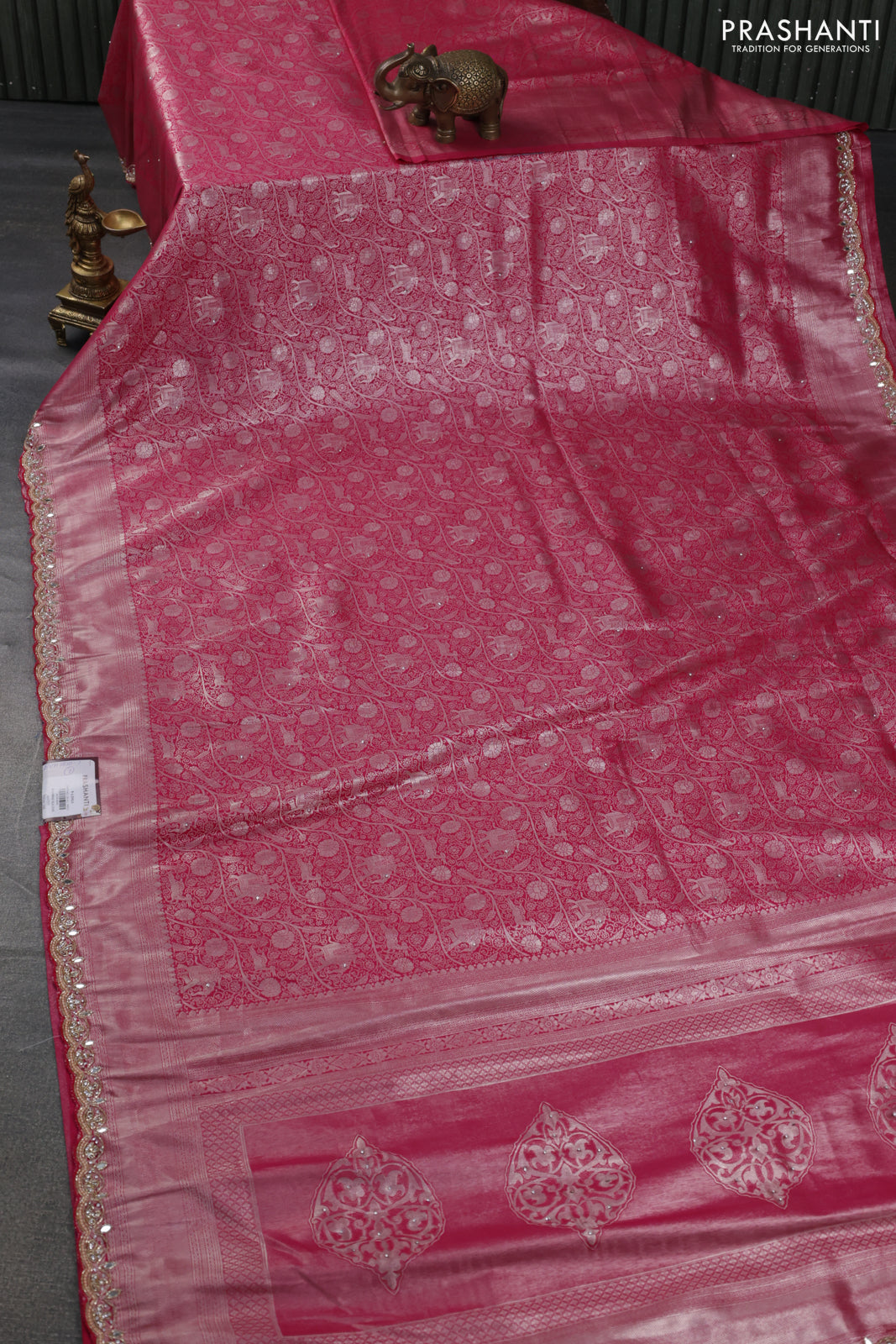 Banarasi silk saree pink with allover zari woven brocade weaves and embroidery mirror work border