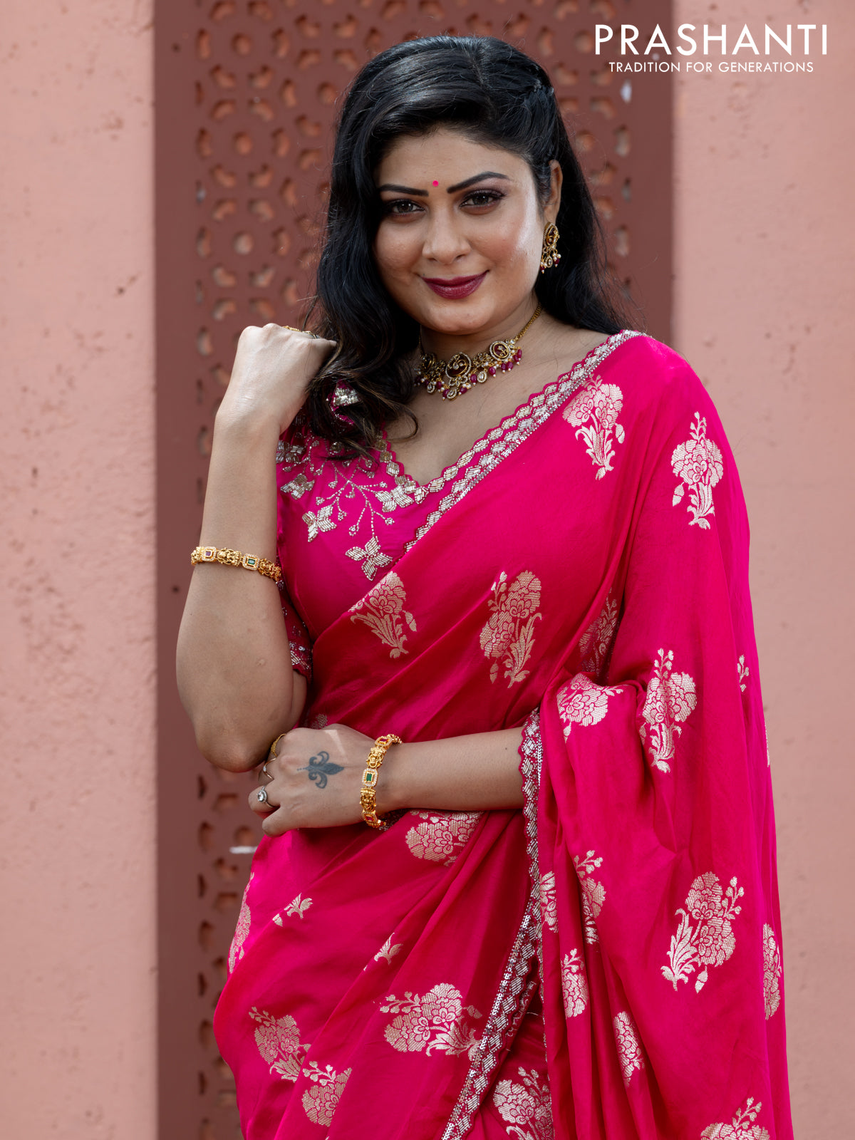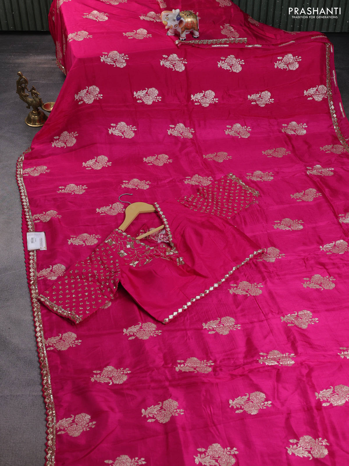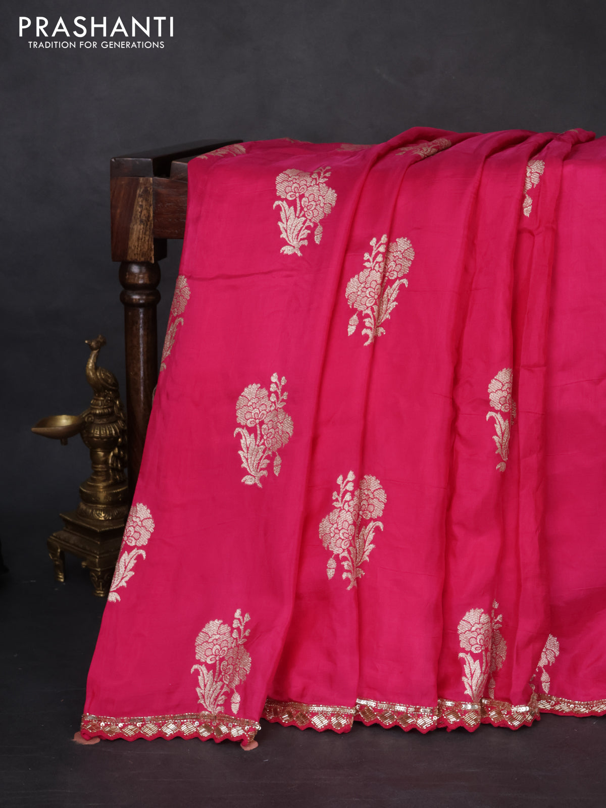 Banarasi silk saree pink with floral zari woven buttas and beaded work border