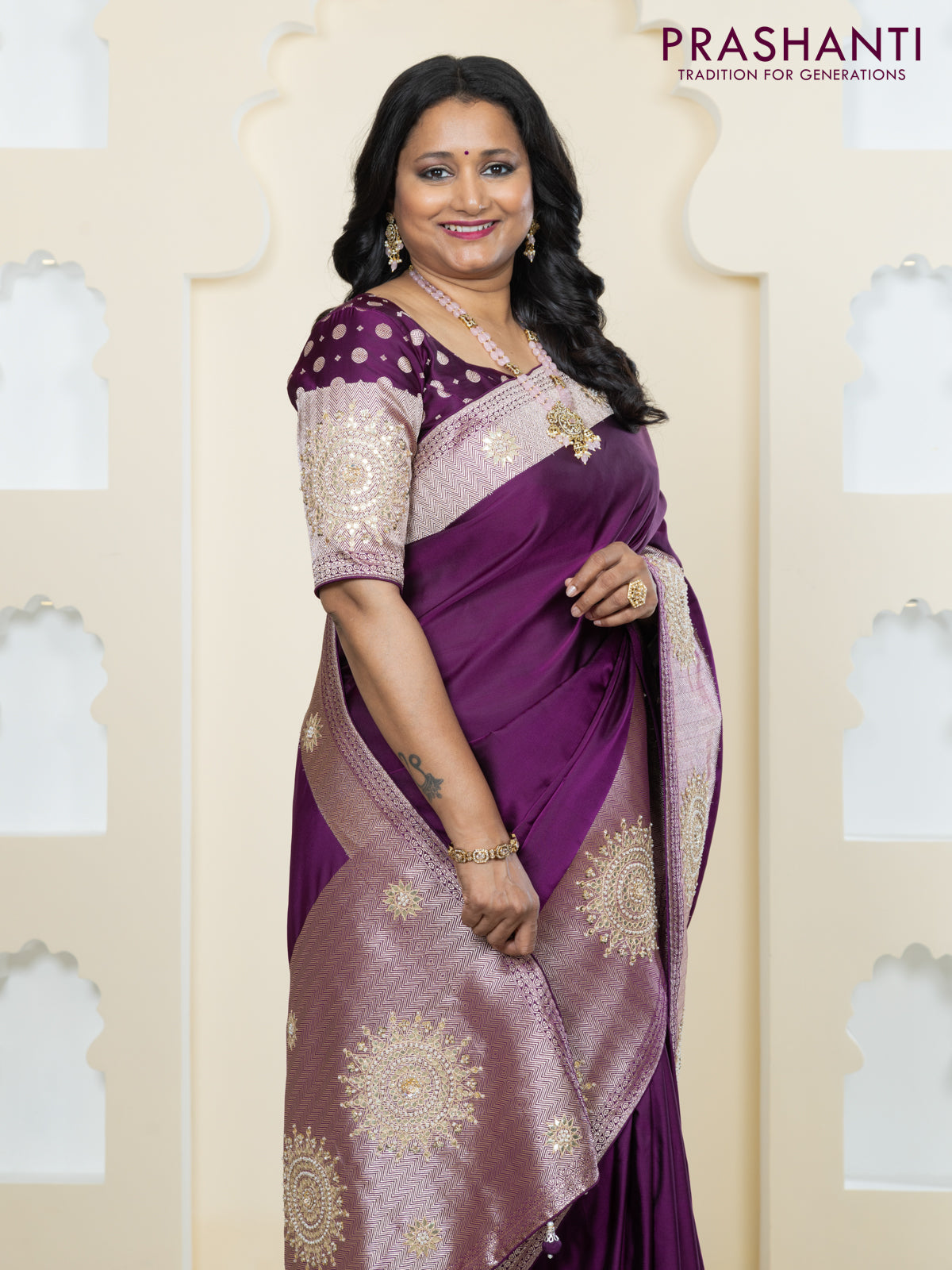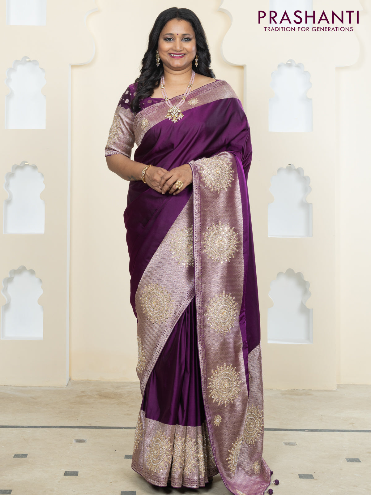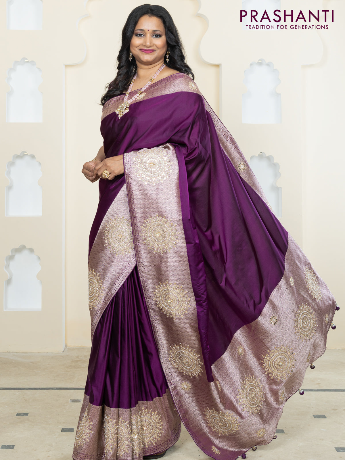 Banarasi silk saree purple with plain body and embroidery butta border