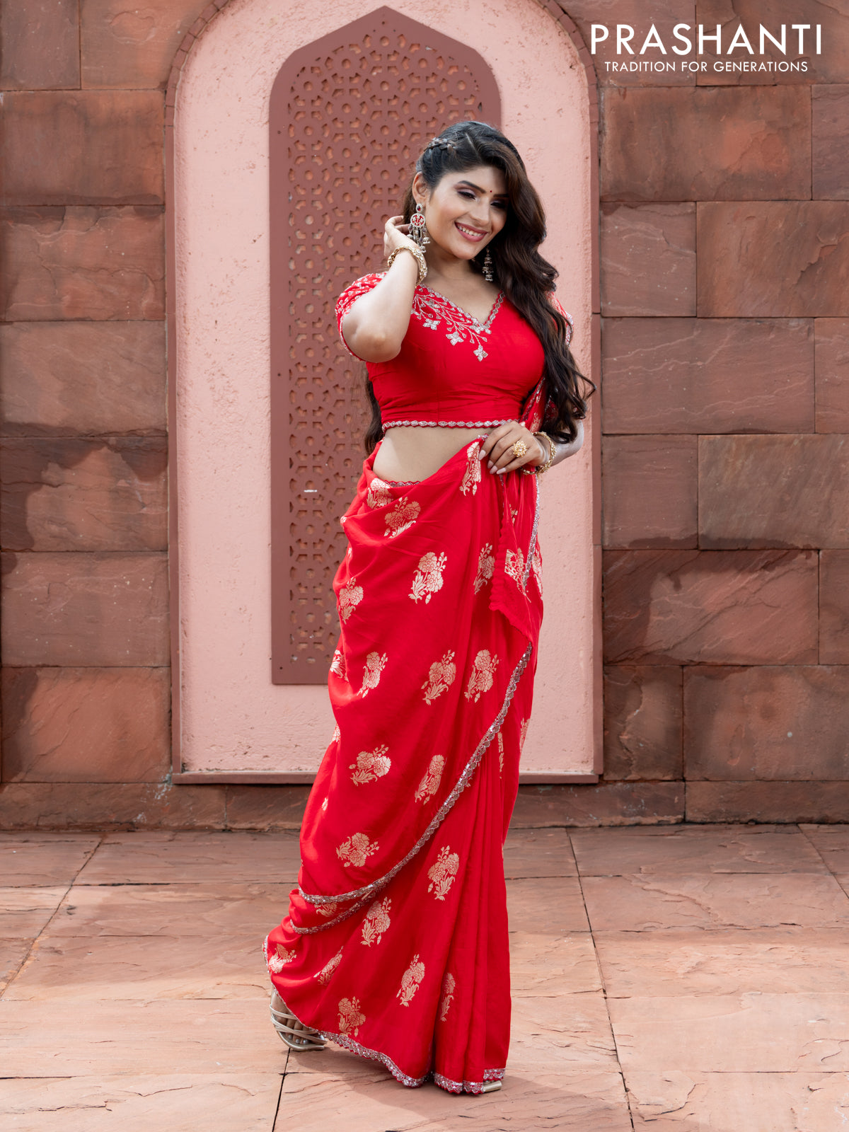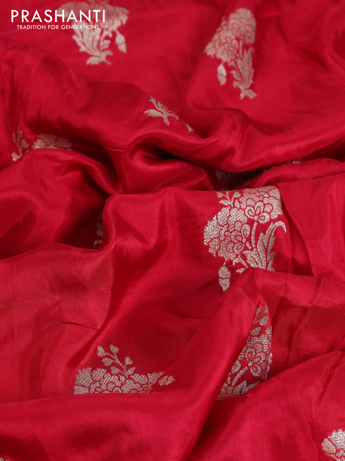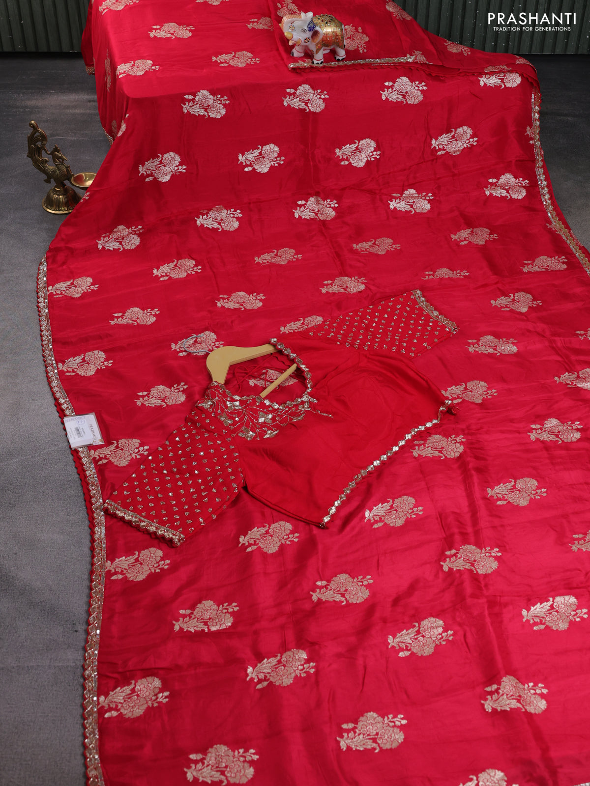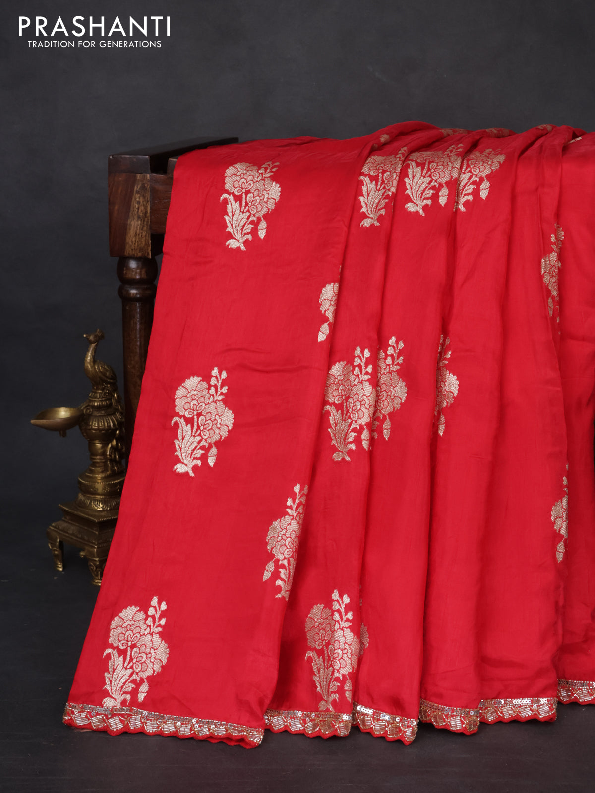 Banarasi silk saree red with floral zari woven buttas and beaded work border