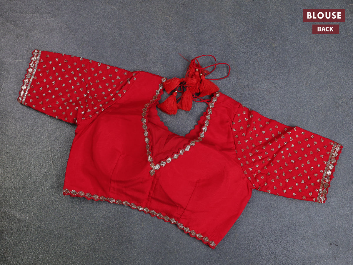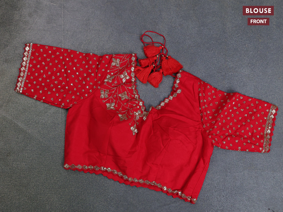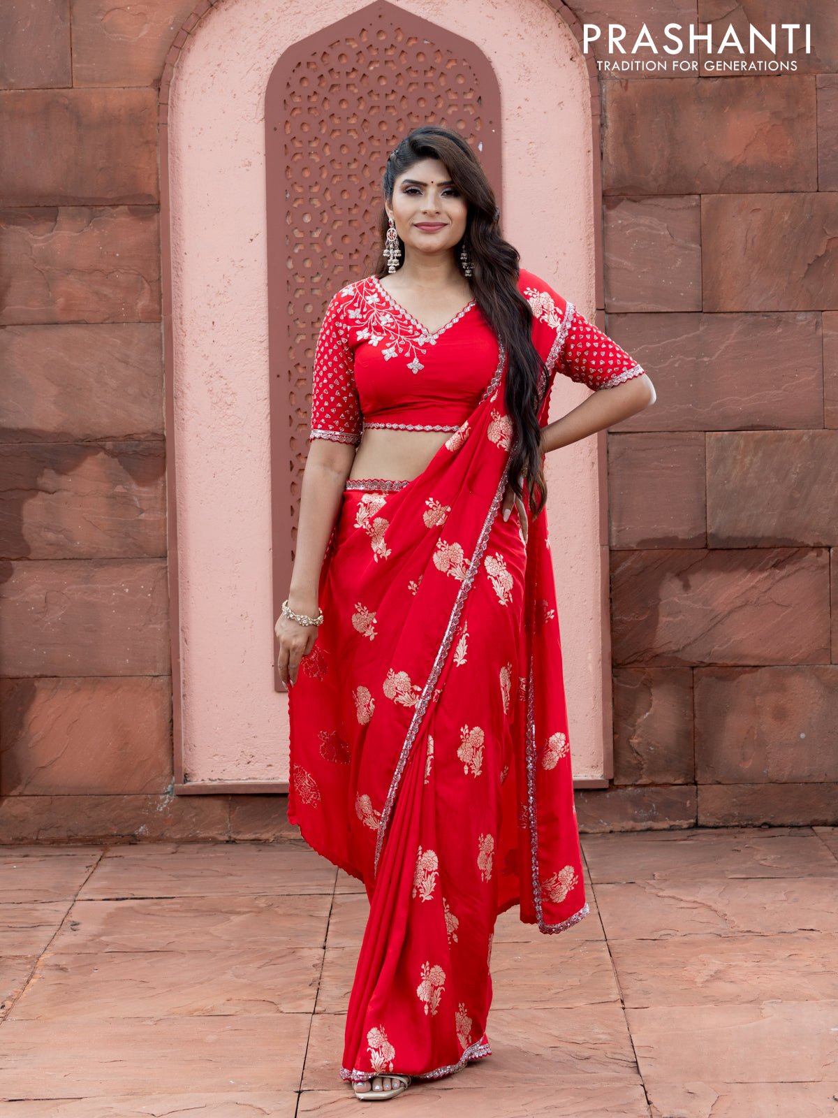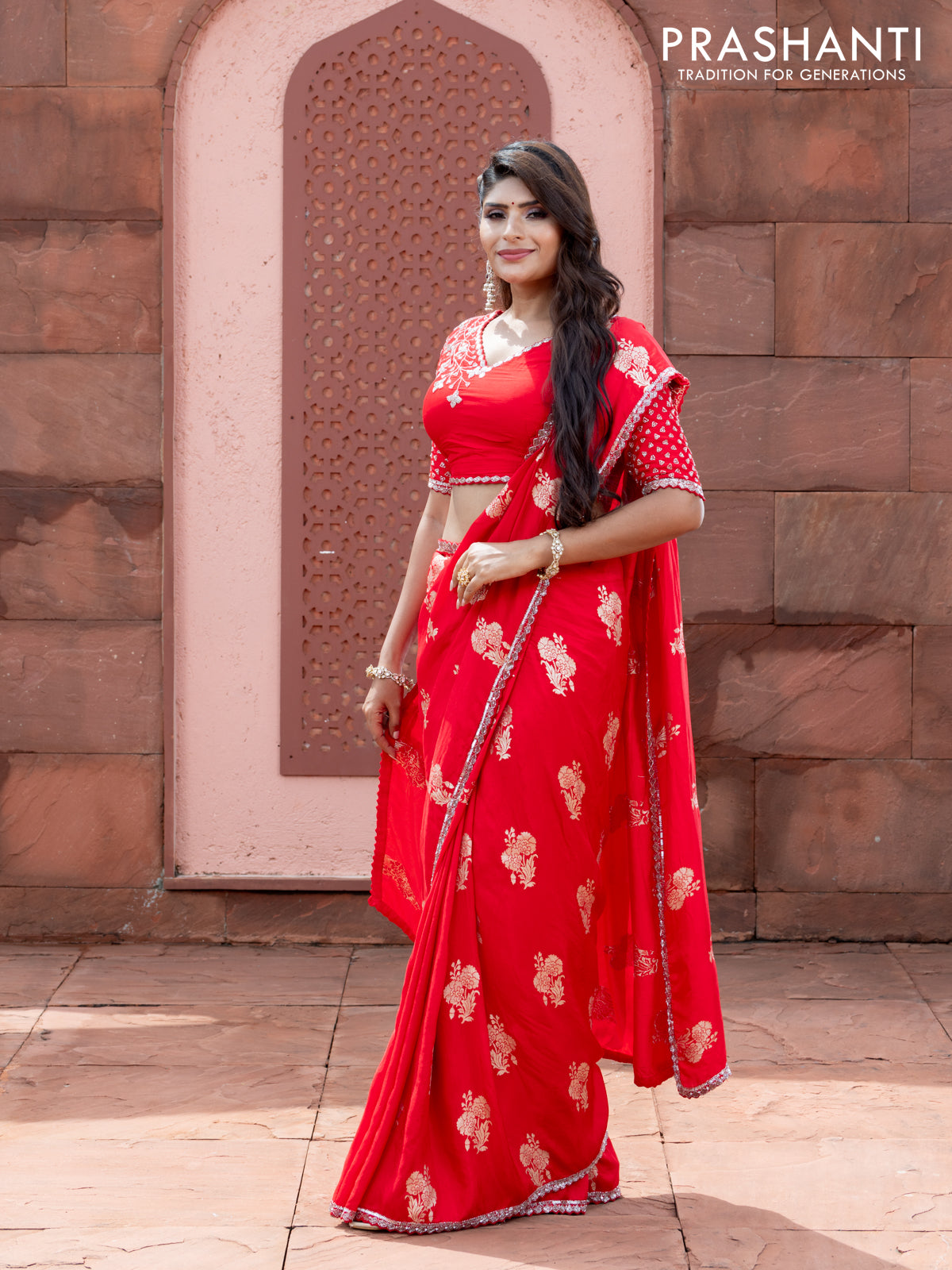 Banarasi silk saree red with floral zari woven buttas and beaded work border