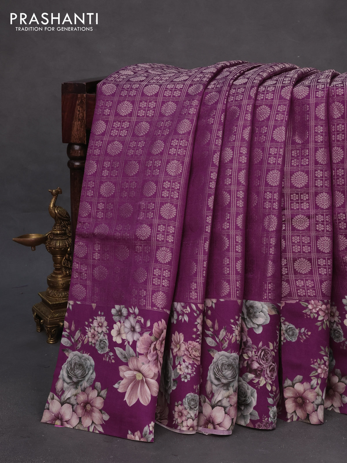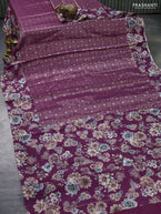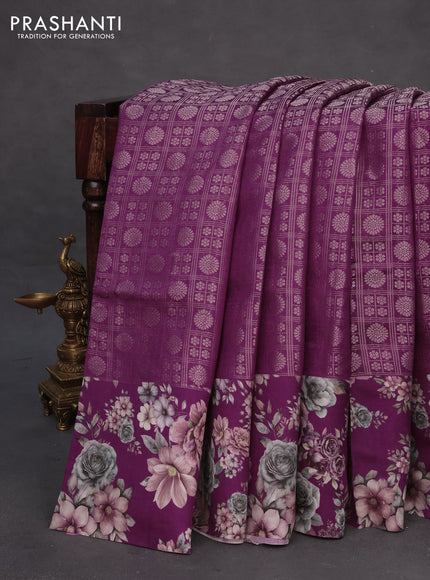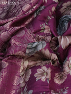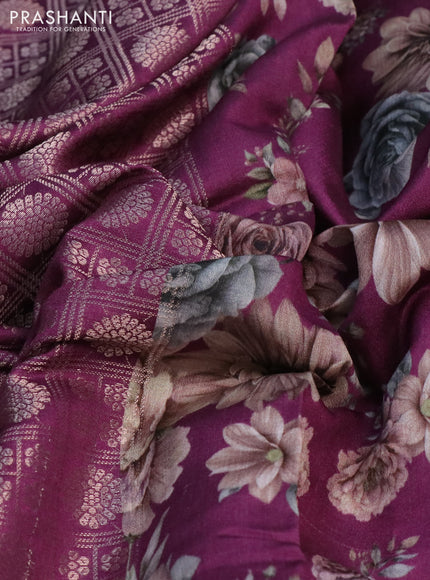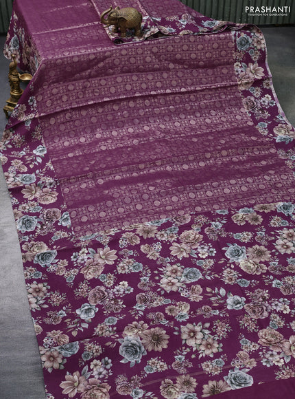 Banarasi silk saree wine shade with allover zari woven brocade weaves and floral digital printed border