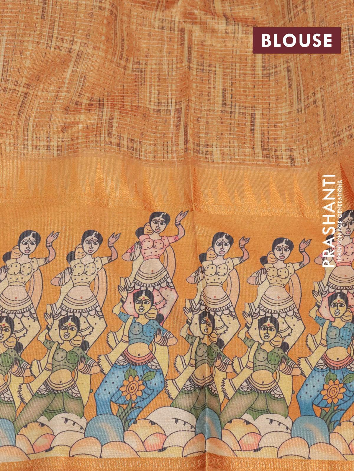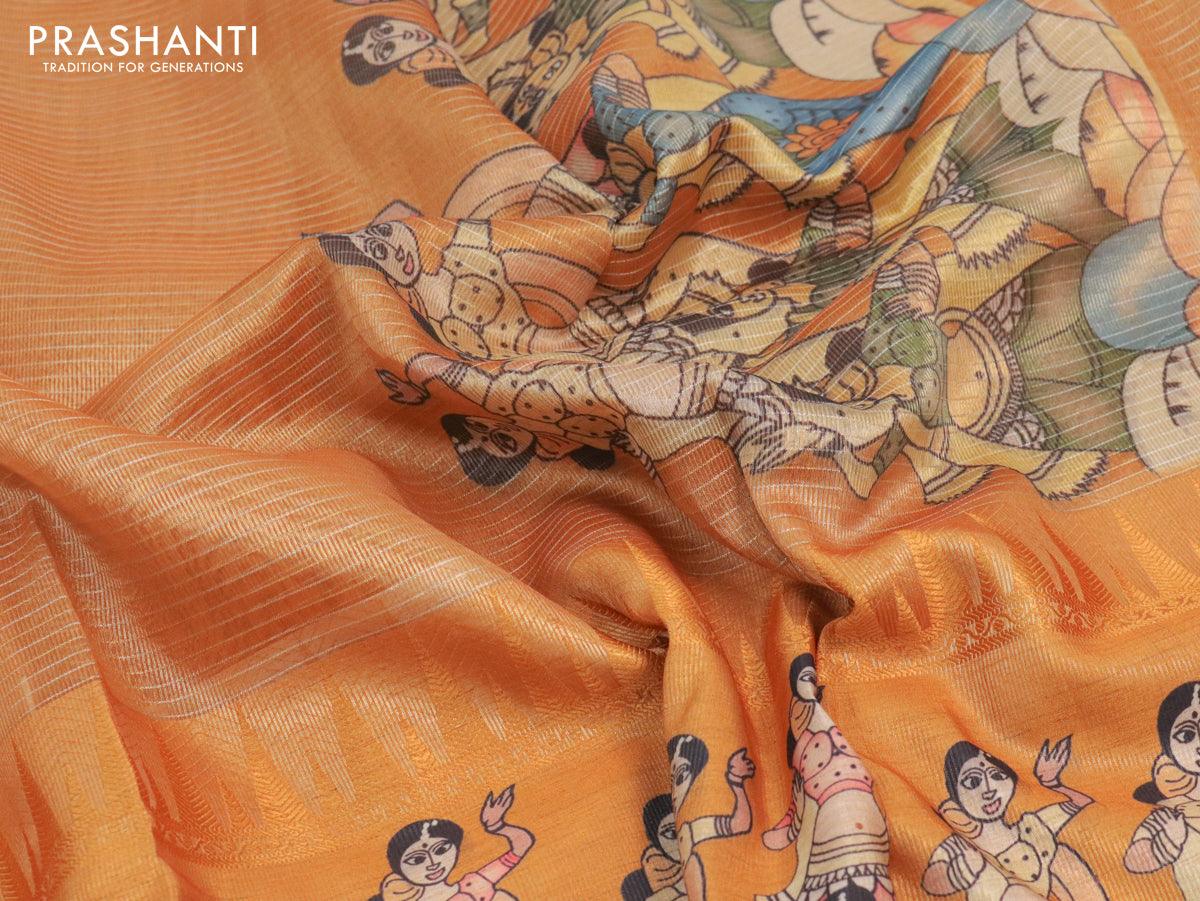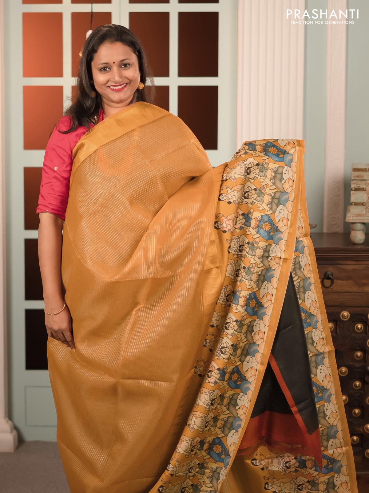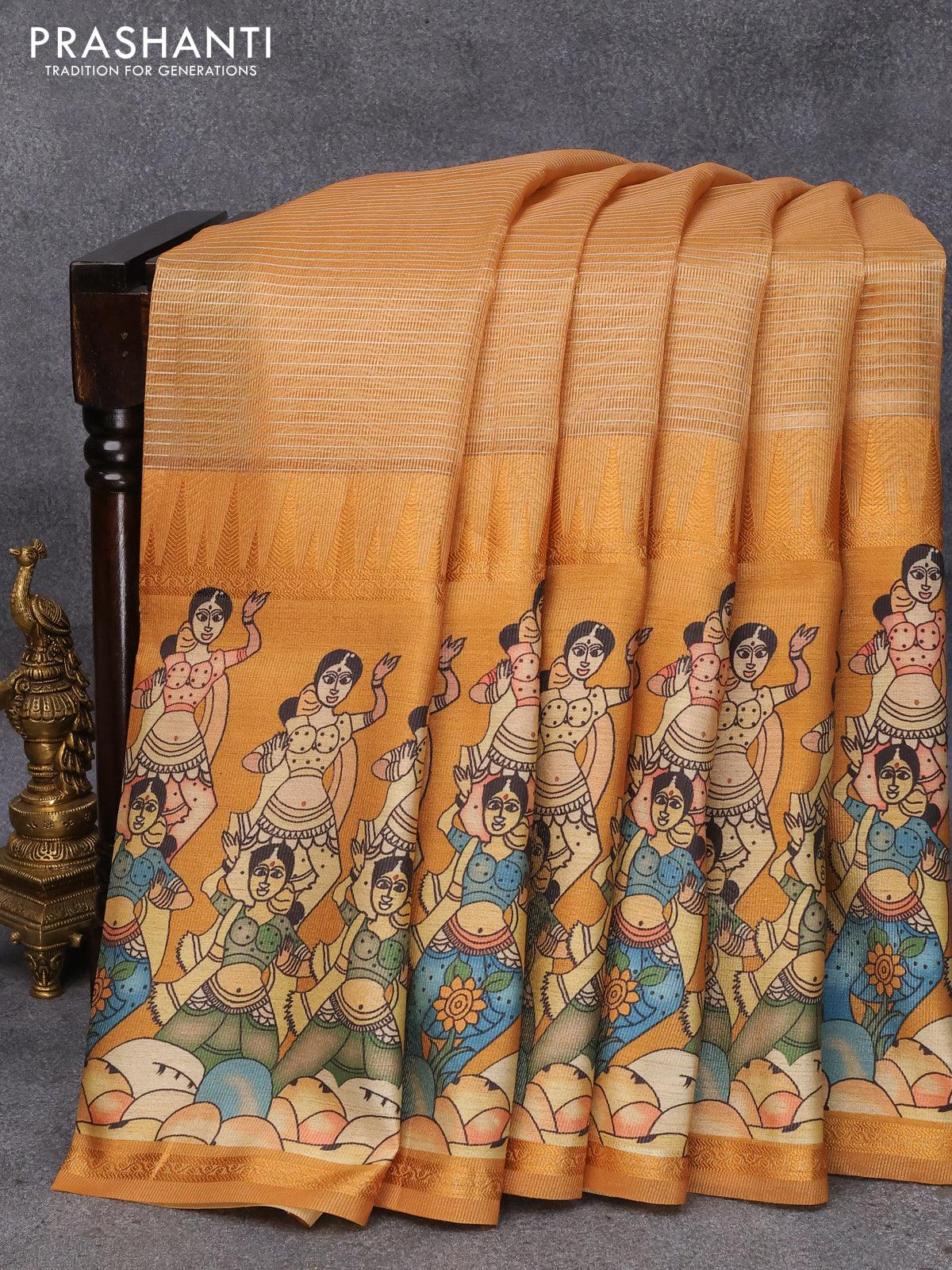 Banarasi tissue organza saree mustard yellow with plain body and kalamkari printed border