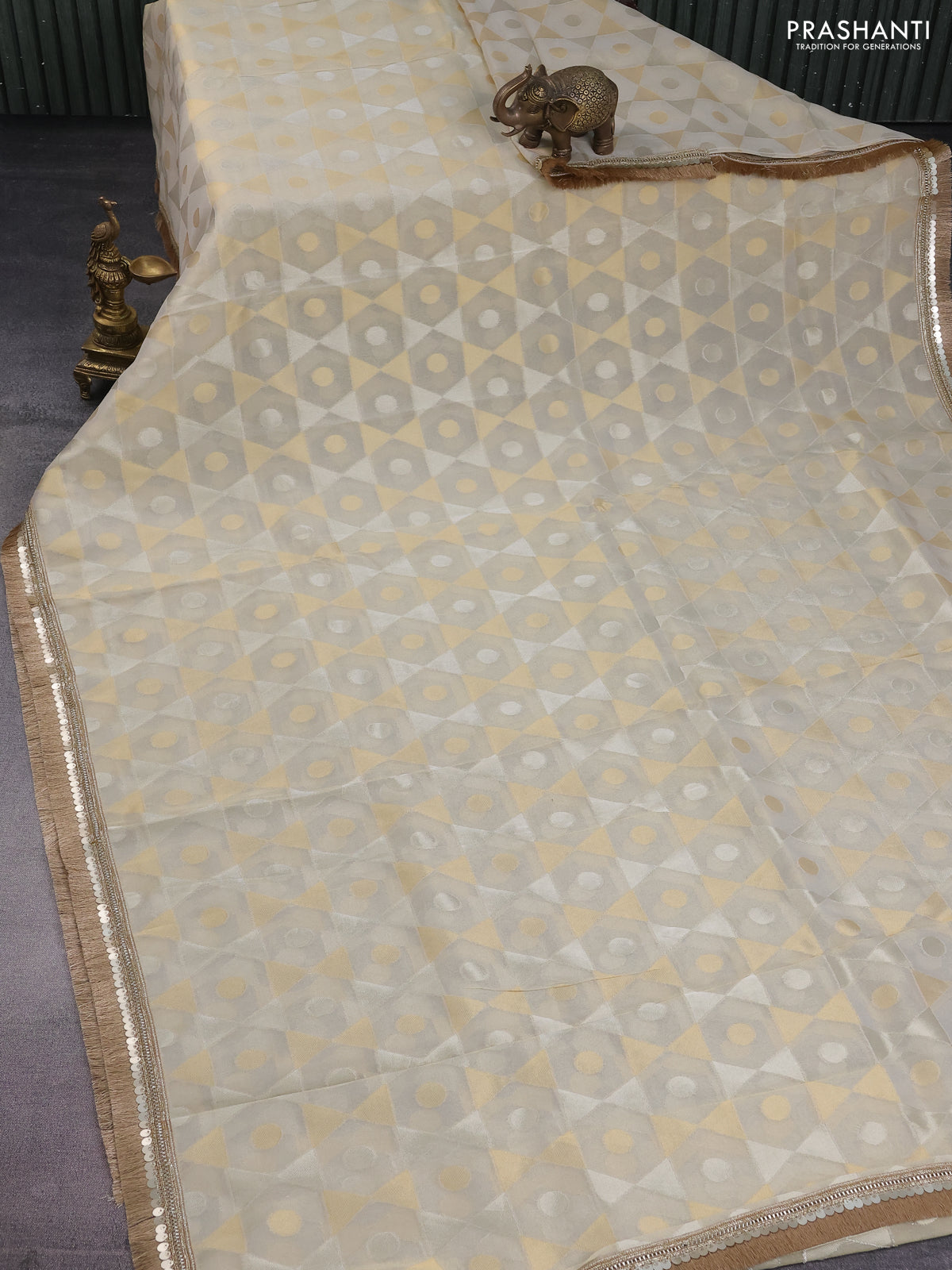 Banarasi tissue saree beige and violet with allover zari woven geometric wevaes and lace work border