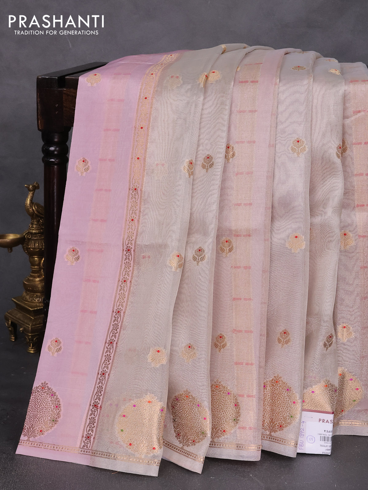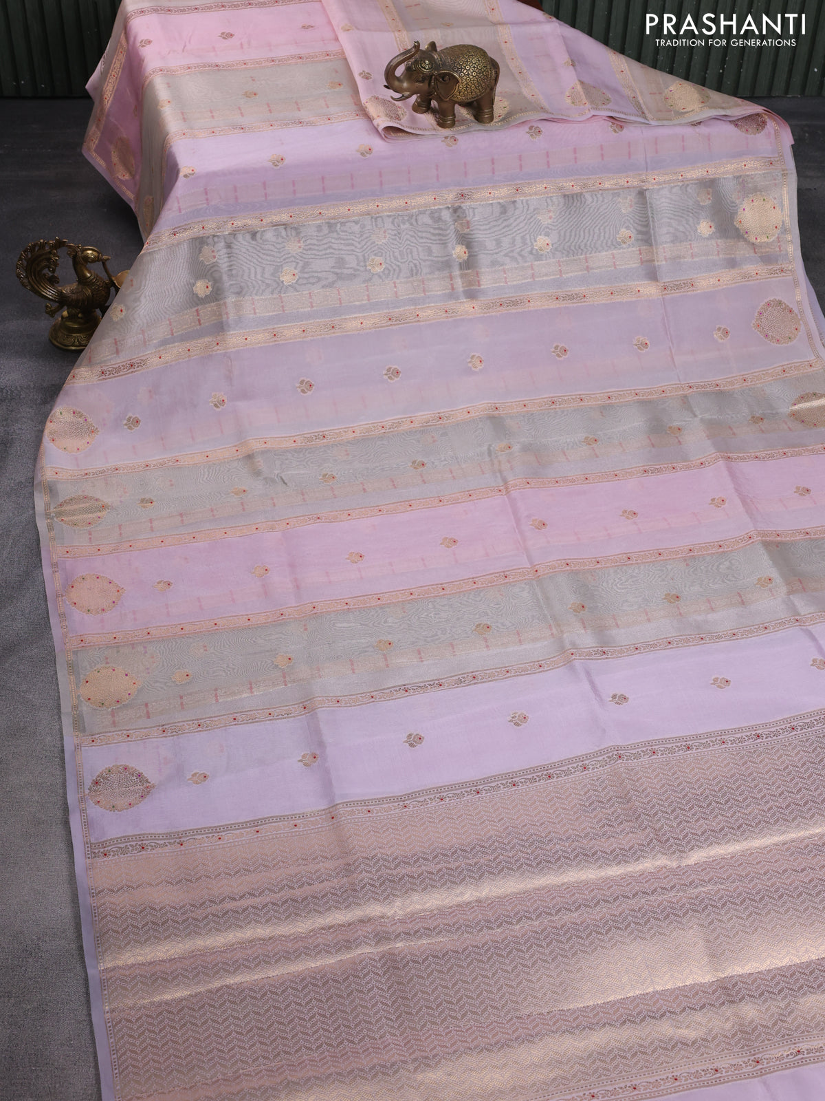Banarasi tissue semi silk saree baby pink and mild lavender with zari weaves & buttas and zari woven butta border