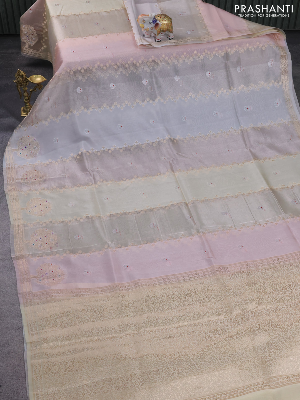 Banarasi tissue semi silk saree off white and cream with zari weaves & buttas and zari woven tree butta border