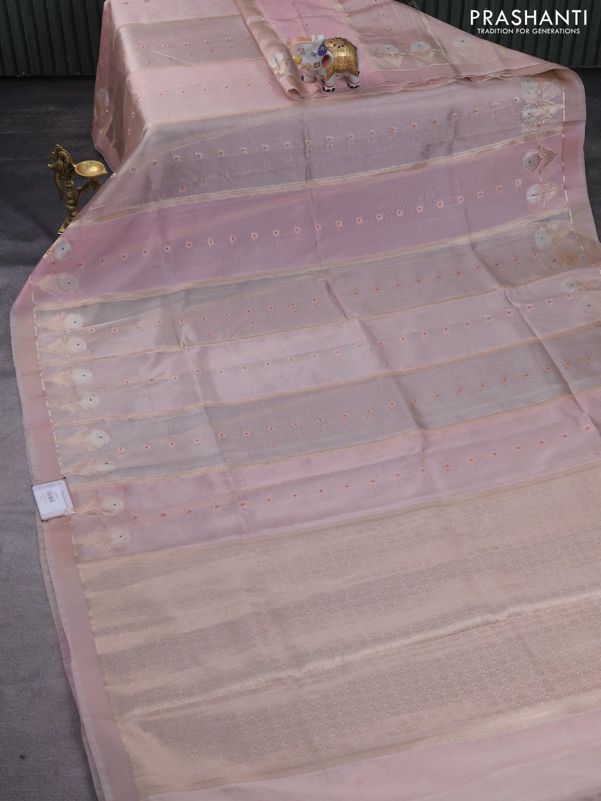 Banarasi tissue semi silk saree pastel peach with zari weaves & buttas and floral zari woven butta border