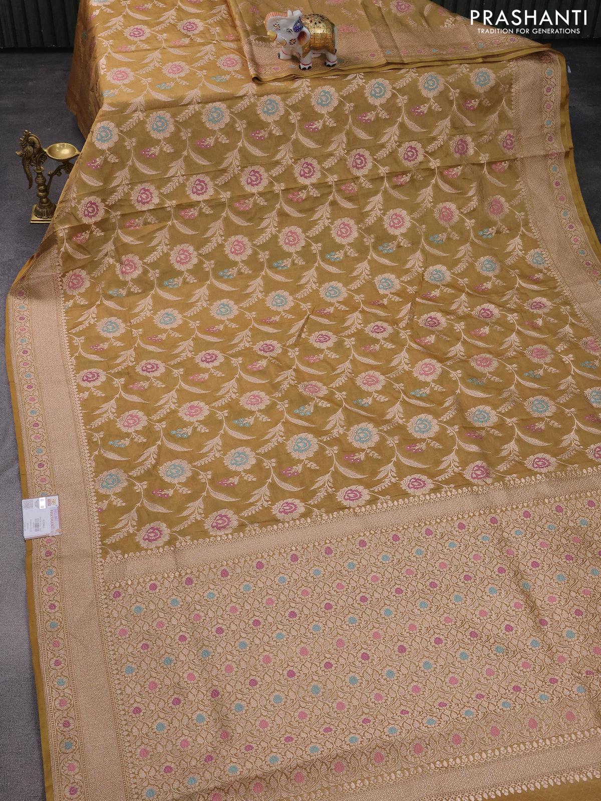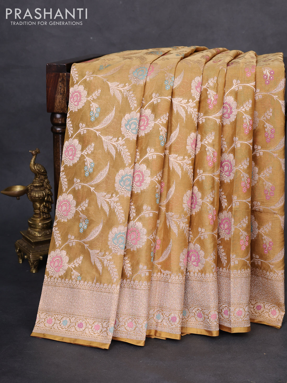 Banarasi tissue silk saree mustard shade with allover thread & zari woven floral weaves and zari woven border