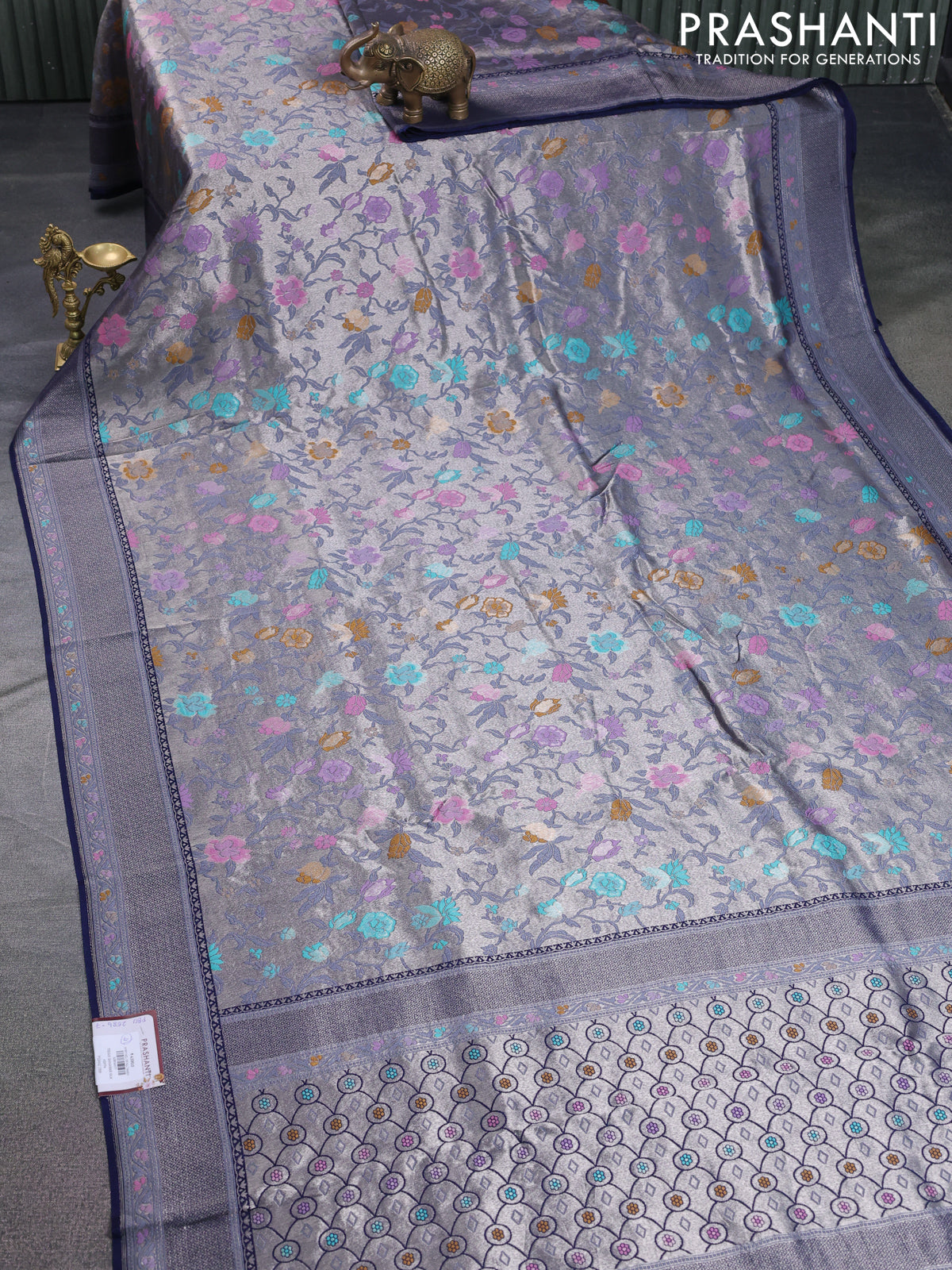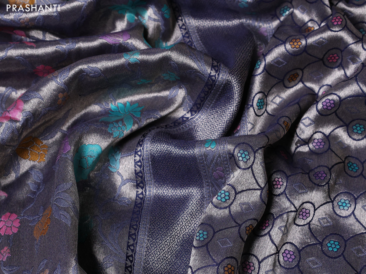 Banarasi tissue silk saree navy blue with allover thread woven floral weaves and silver zari woven border