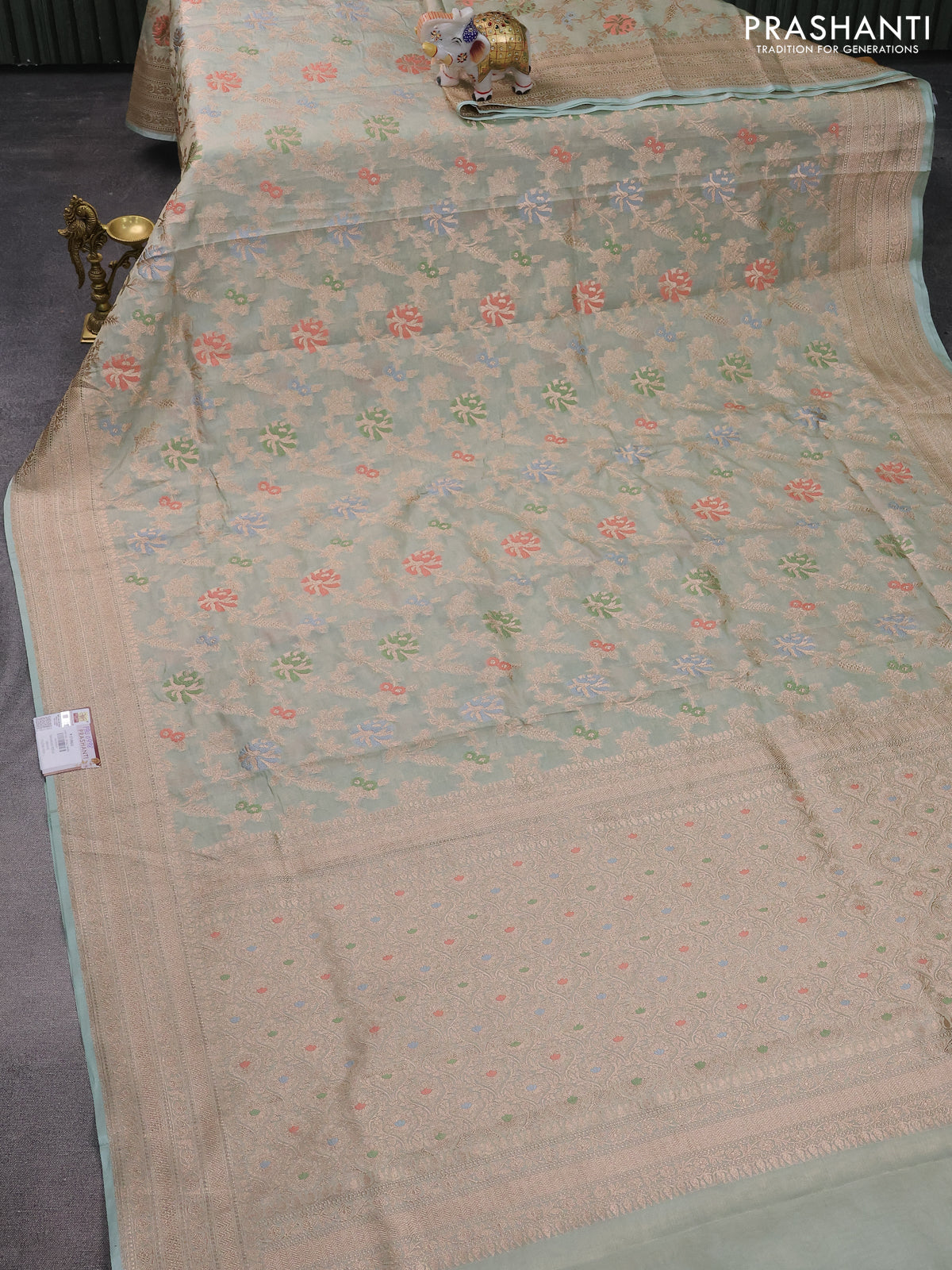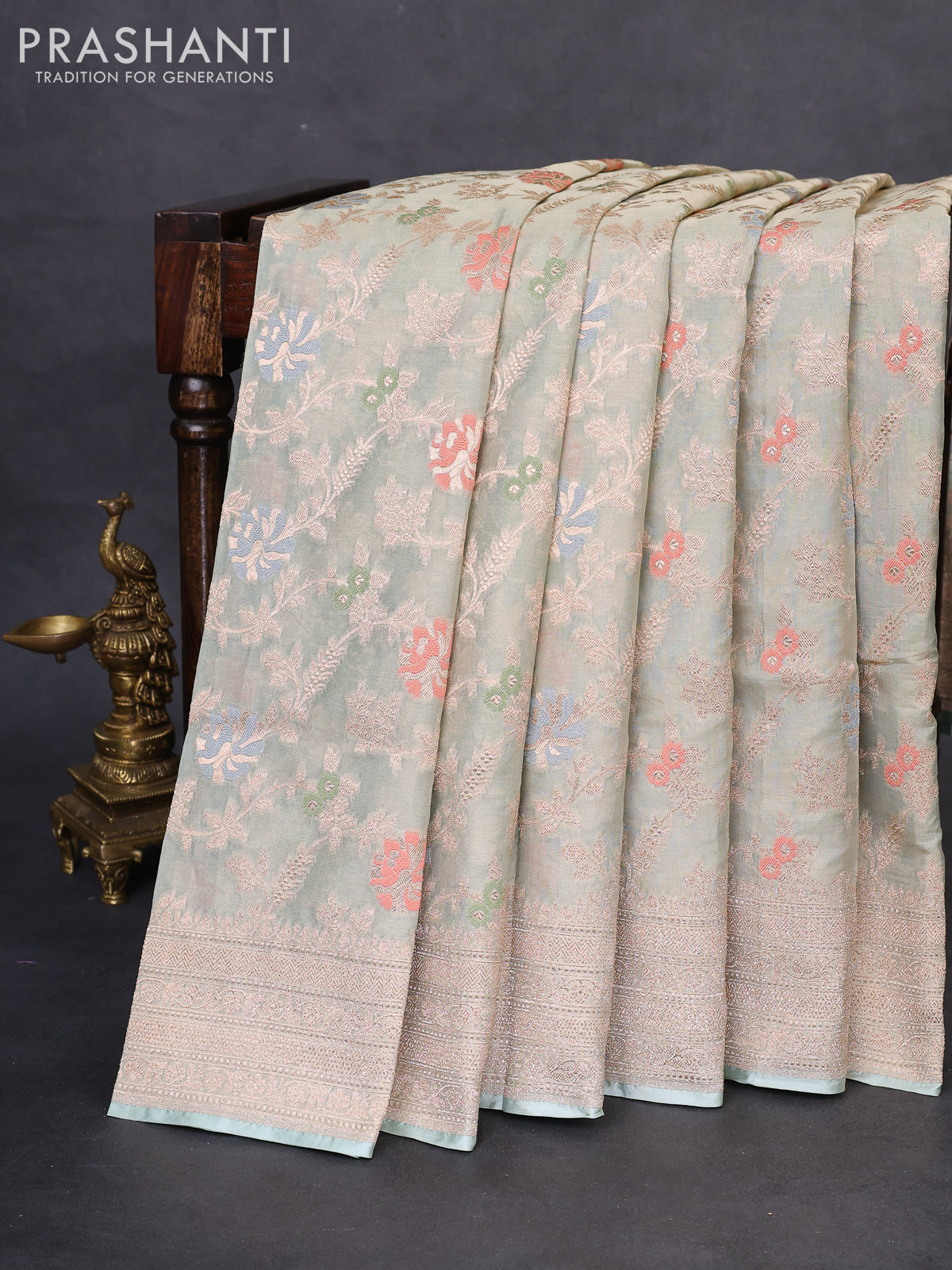 Banarasi tissue silk saree pastel green shade with allover thread & zari woven floral weaves and zari woven border