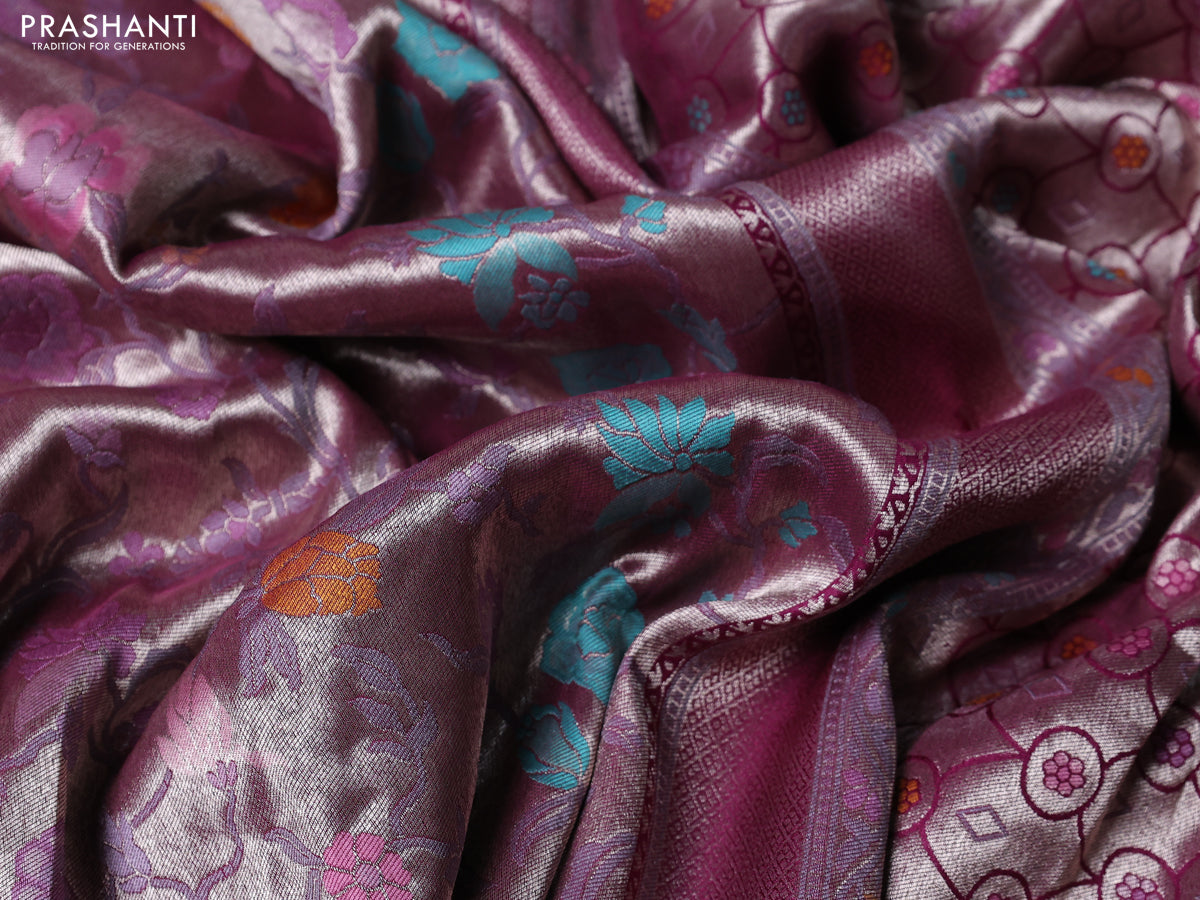 Banarasi tissue silk saree wine shade with allover thread woven floral weaves and silver zari woven border