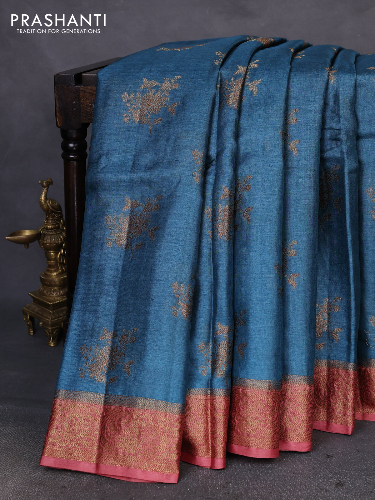 Banarasi tussar silk saree blue and rust shade with thread & zari woven floral buttas and woven border