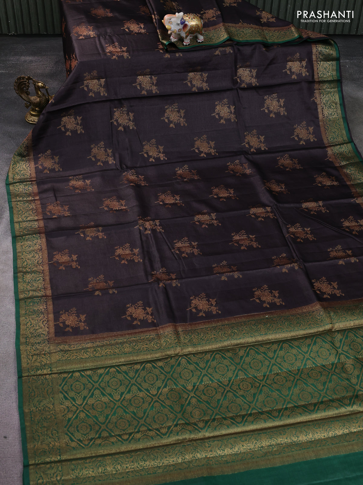 Banarasi tussar silk saree coffee brown and green with thread & zari woven floral buttas and woven border