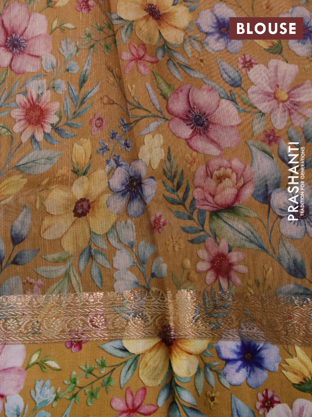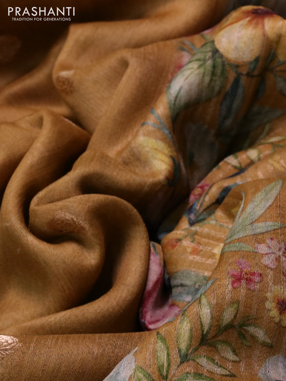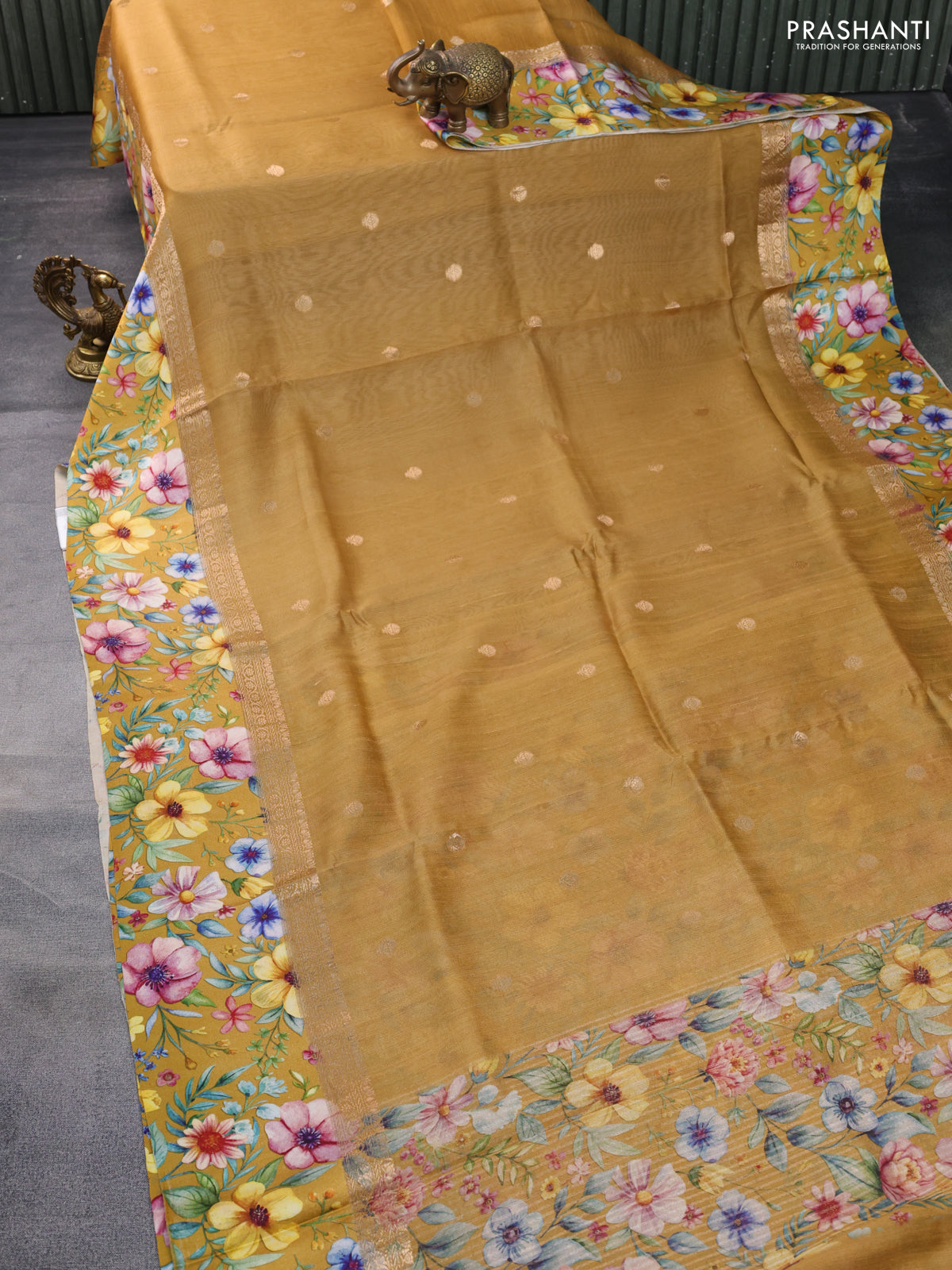 Banarasi tussar silk saree dark mustard and mustard yellow with zari woven buttas and zari woven floral digital printed border