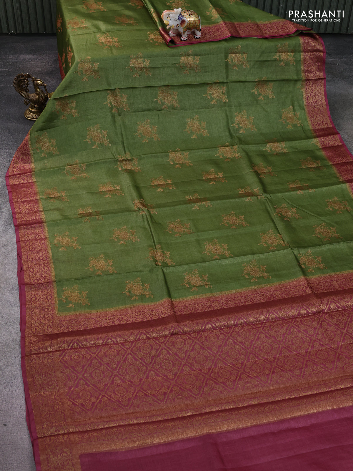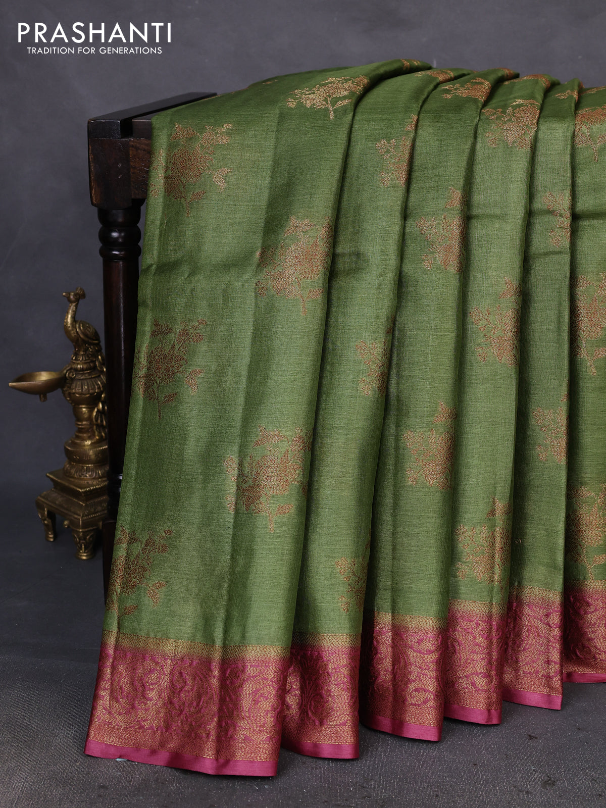 Banarasi tussar silk saree green and pastel maroon with thread & zari woven floral buttas and woven border