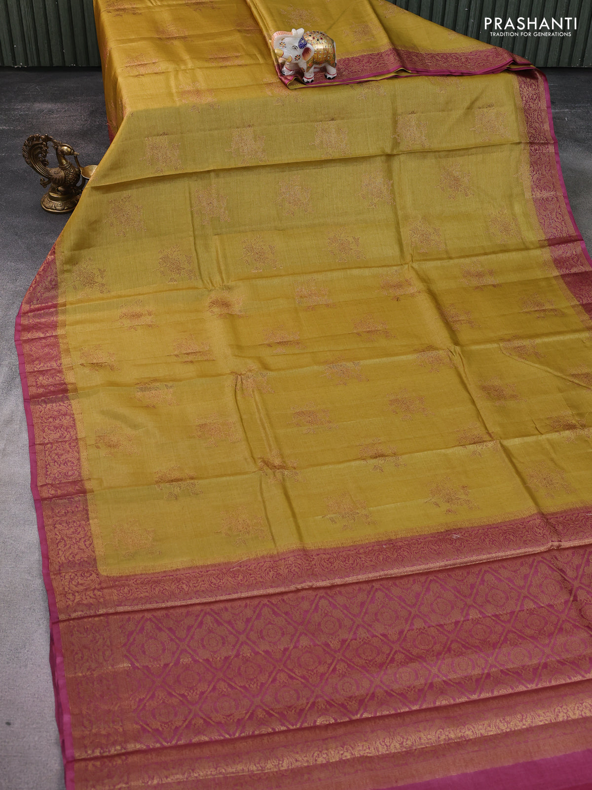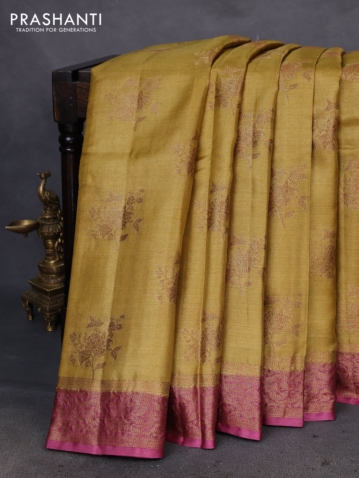Banarasi tussar silk saree mustard shade and mauve pink with thread & zari woven floral buttas and woven border