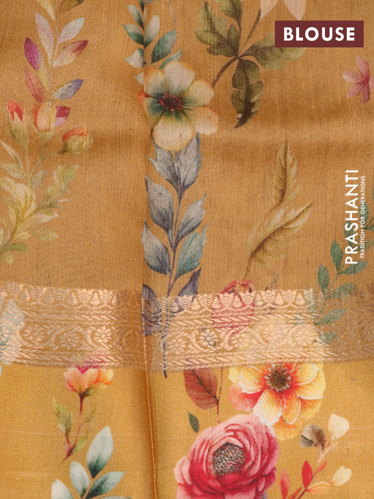 Banarasi tussar silk saree mustard yellow with zari woven buttas and zari woven floral digital printed border