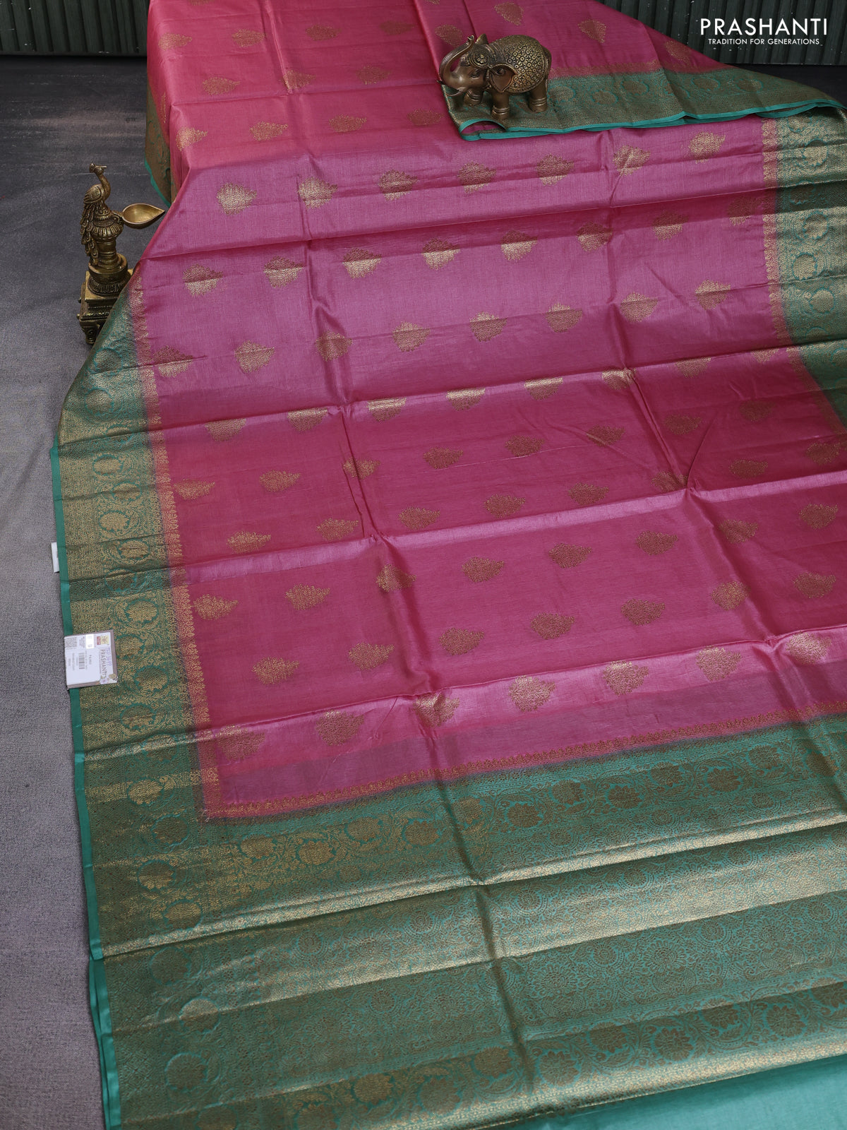 Banarasi tussar silk saree peach pink and teal green shade with thread & zari buttas and banarasi style border