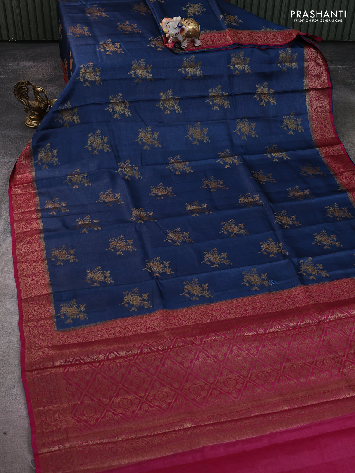 Banarasi tussar silk saree peacock blue and dark pink with allover thread & zari woven buttas and woven border