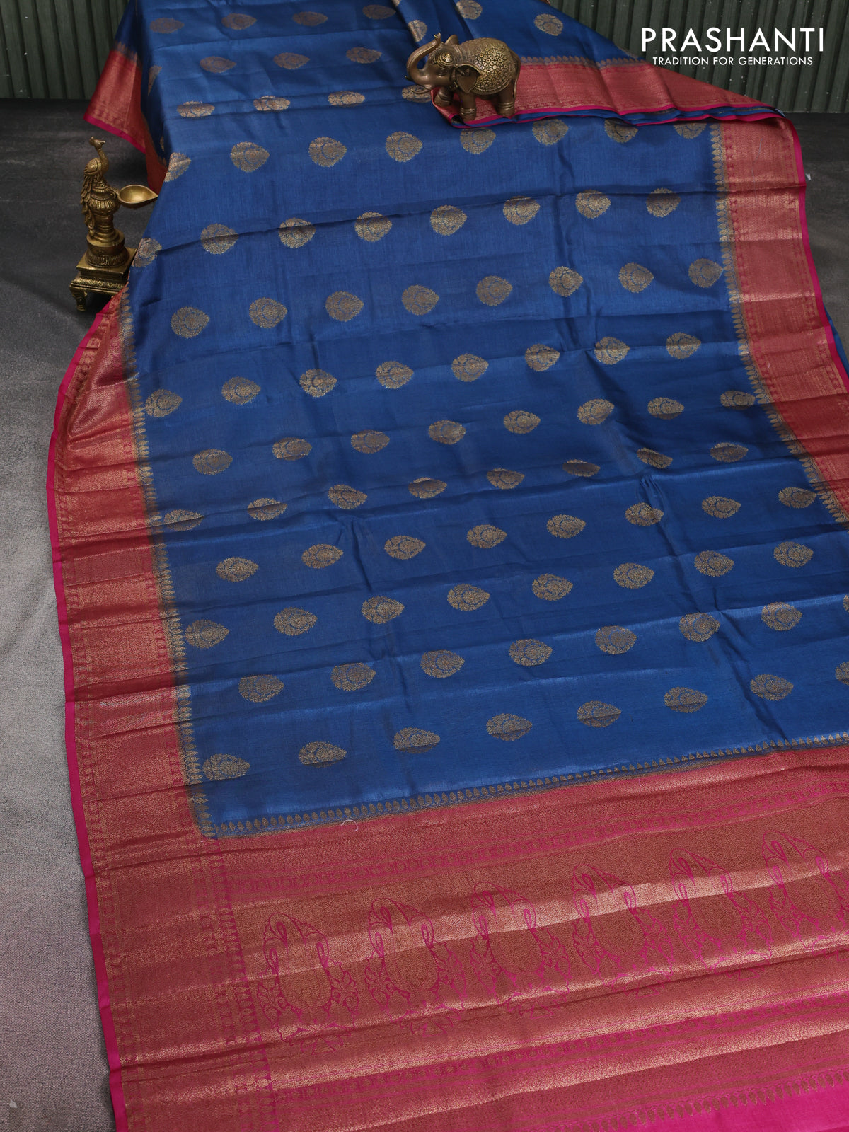 Banarasi tussar silk saree peacock blue and magenta pink with thread & zari woven buttas and woven border