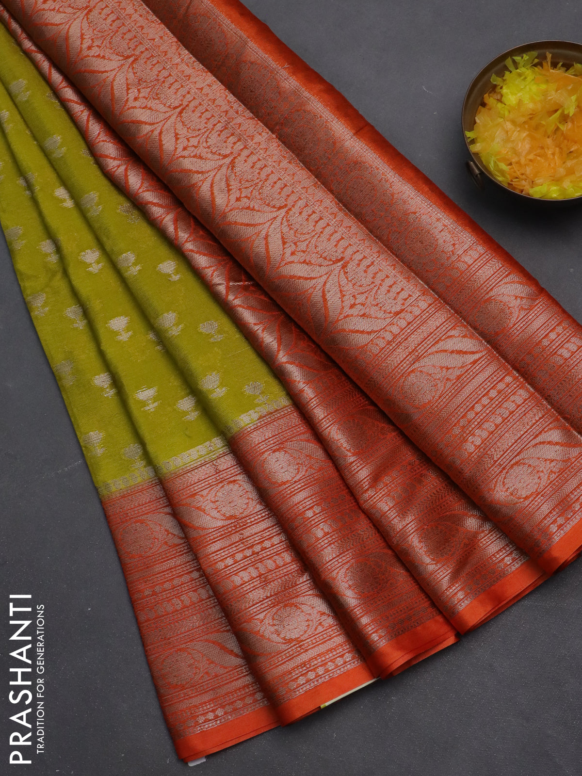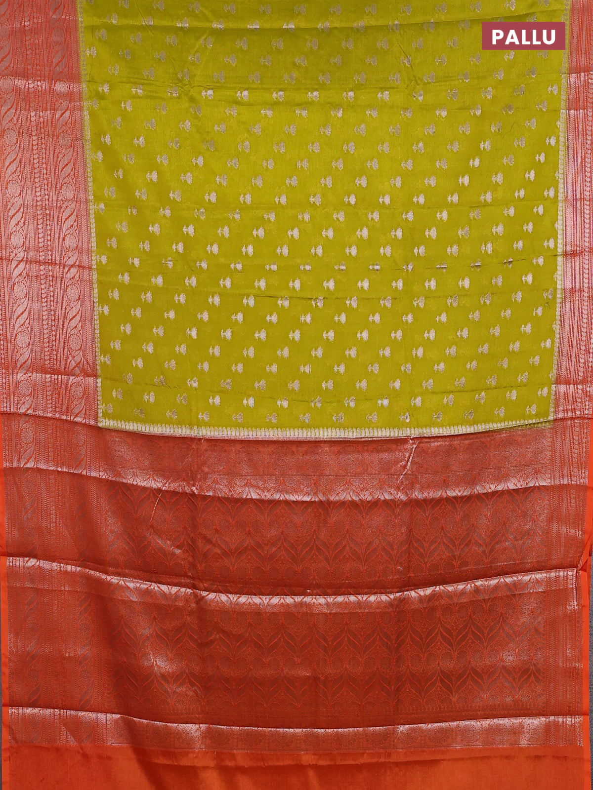 Banarasi warm silk saree lime green and orange with woven buttas and woven border
