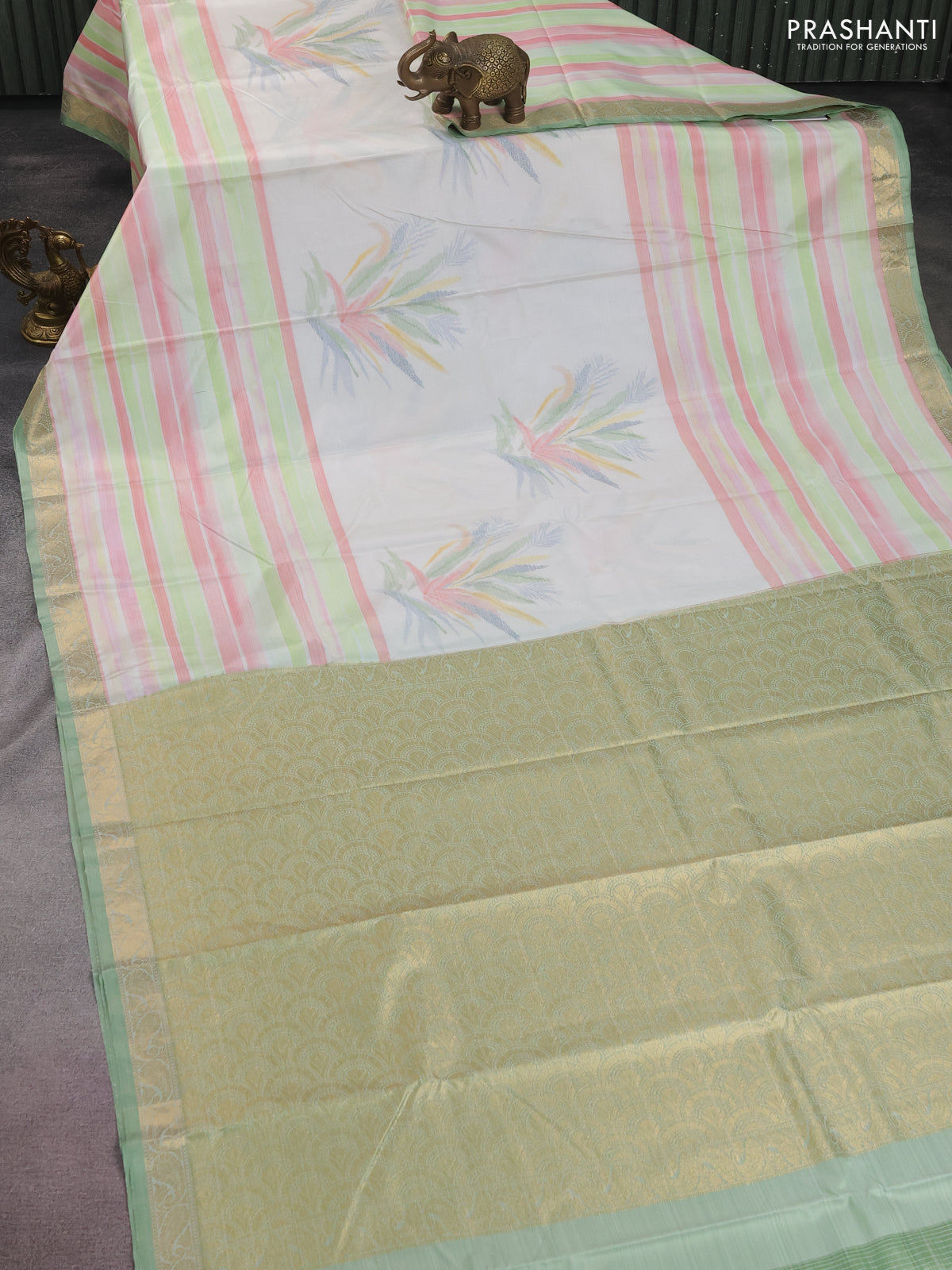 Bangalori semi silk saree cream and pastel green with allover ikat weaves and zari woven border