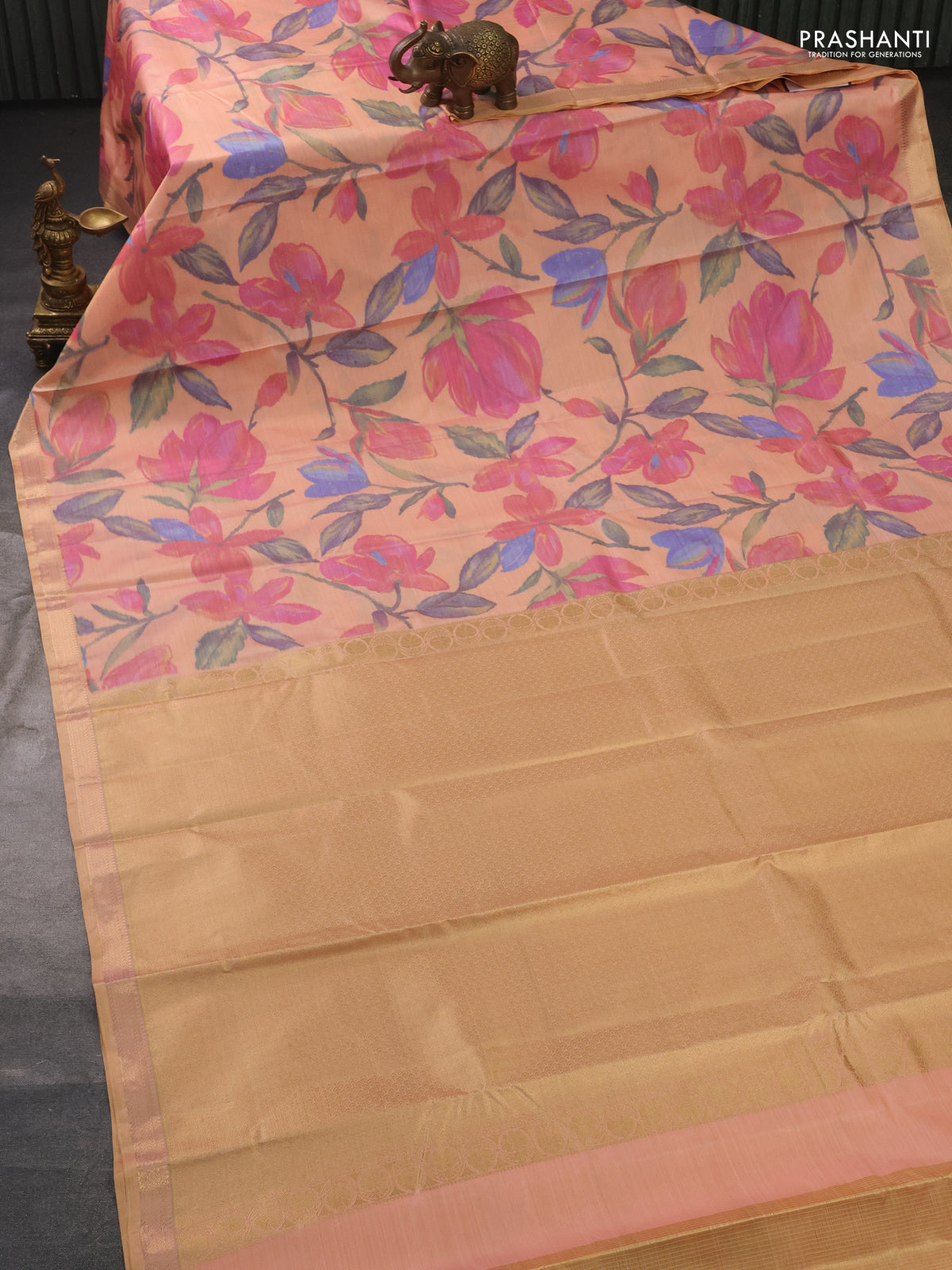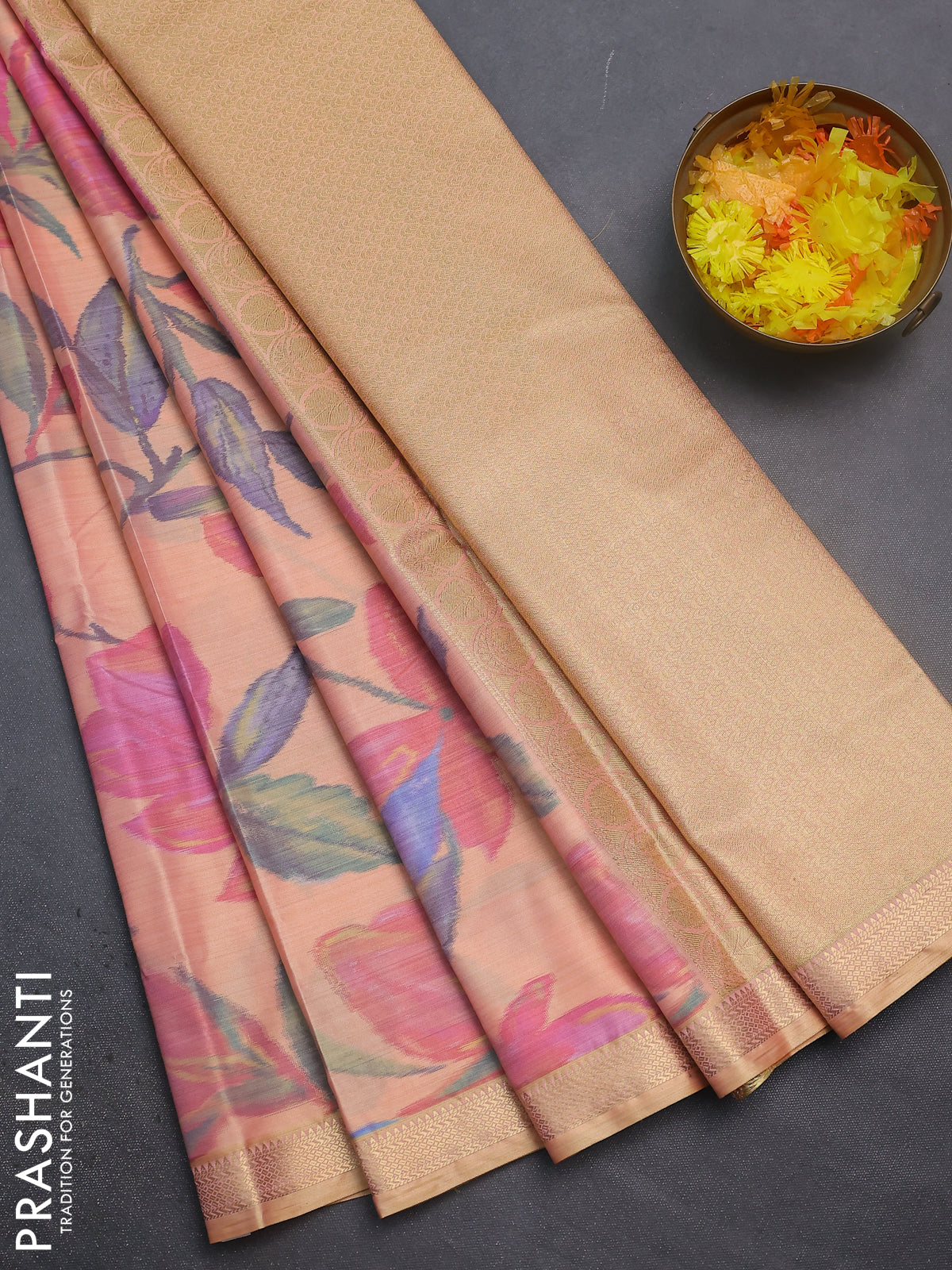 Bangalori semi silk saree pale orange with floral design ikat weaves and zari woven border