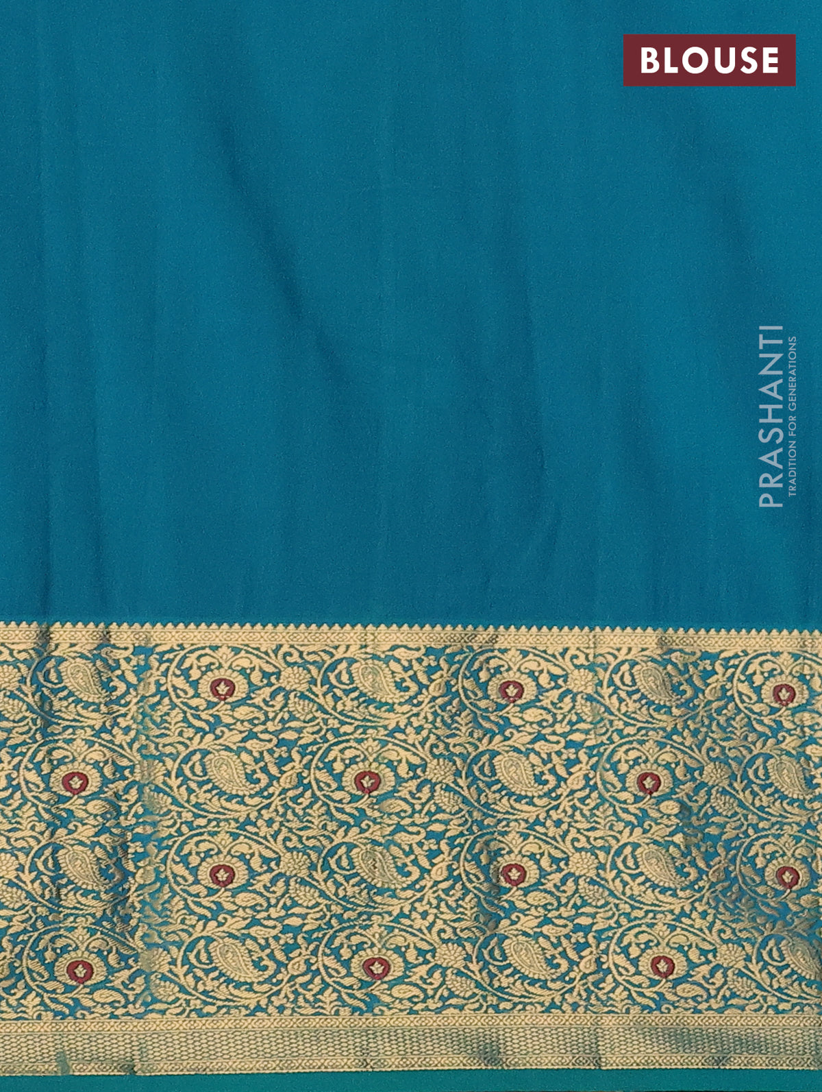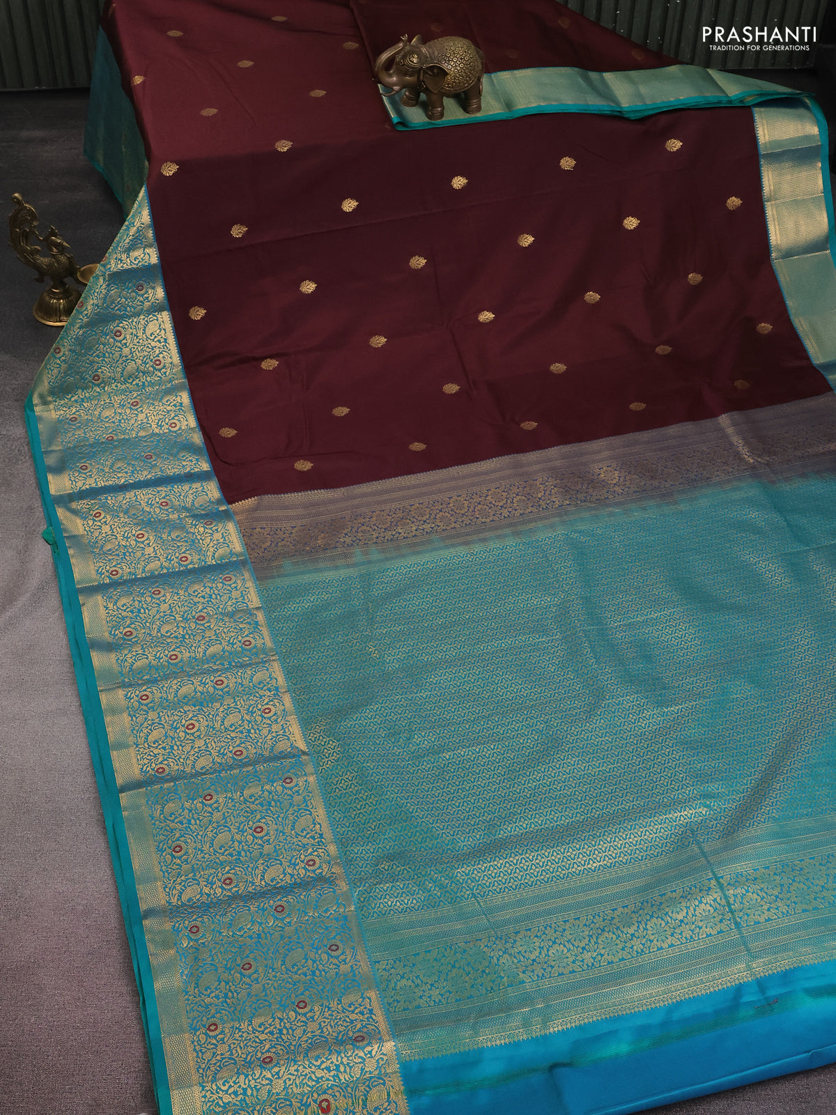 Bangalori silk saree deep maroon and teal green with zari woven buttas and long zari woven border and Butta style