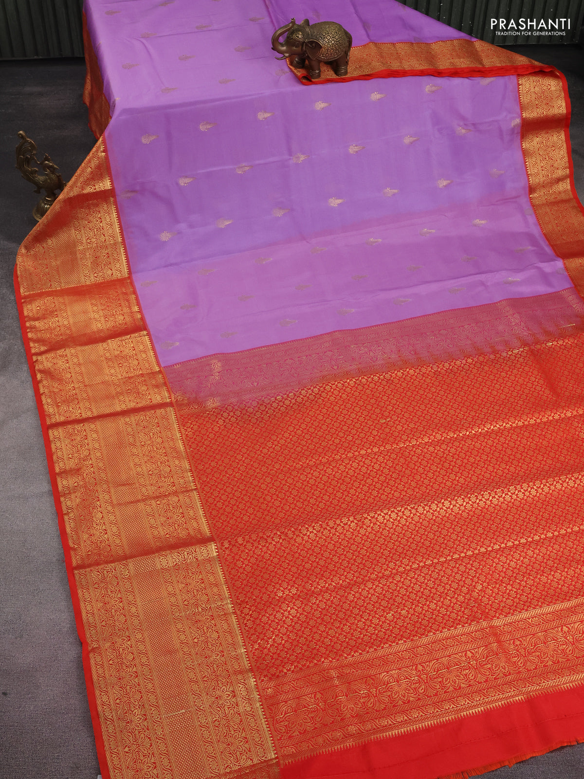 Bangalori silk saree lavender and red with zari woven buttas and long zari woven border and Butta style