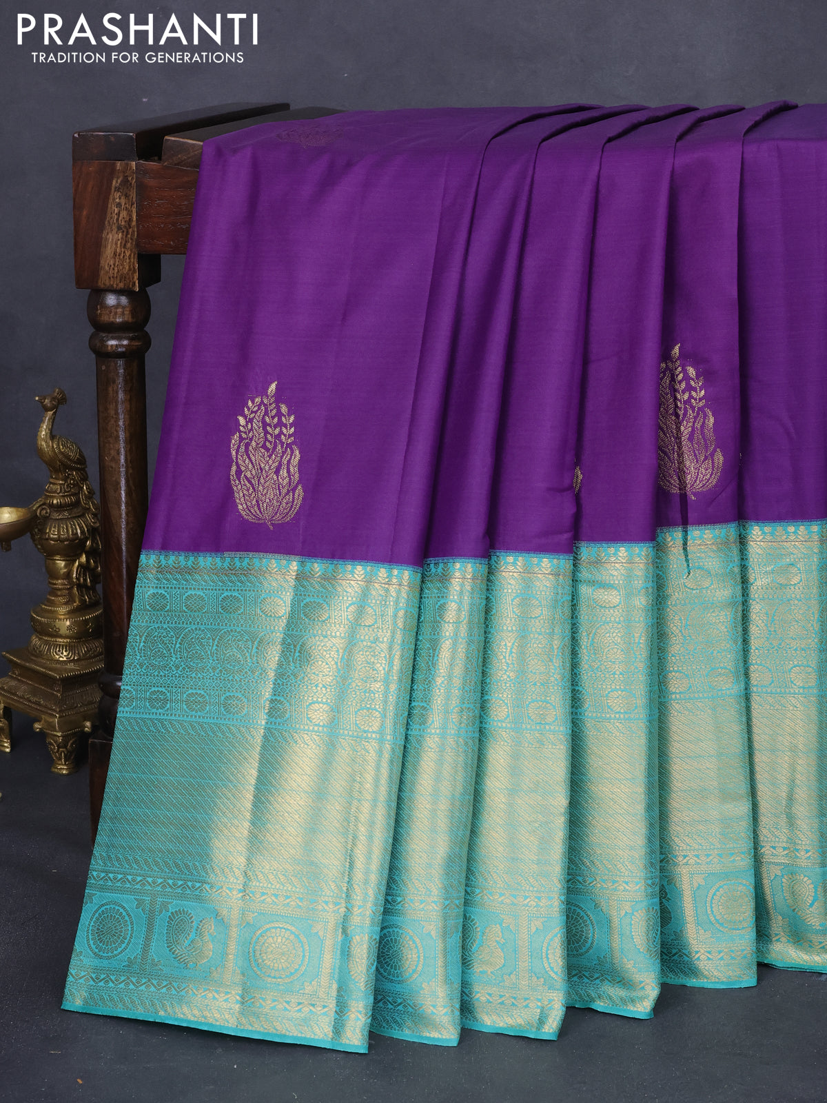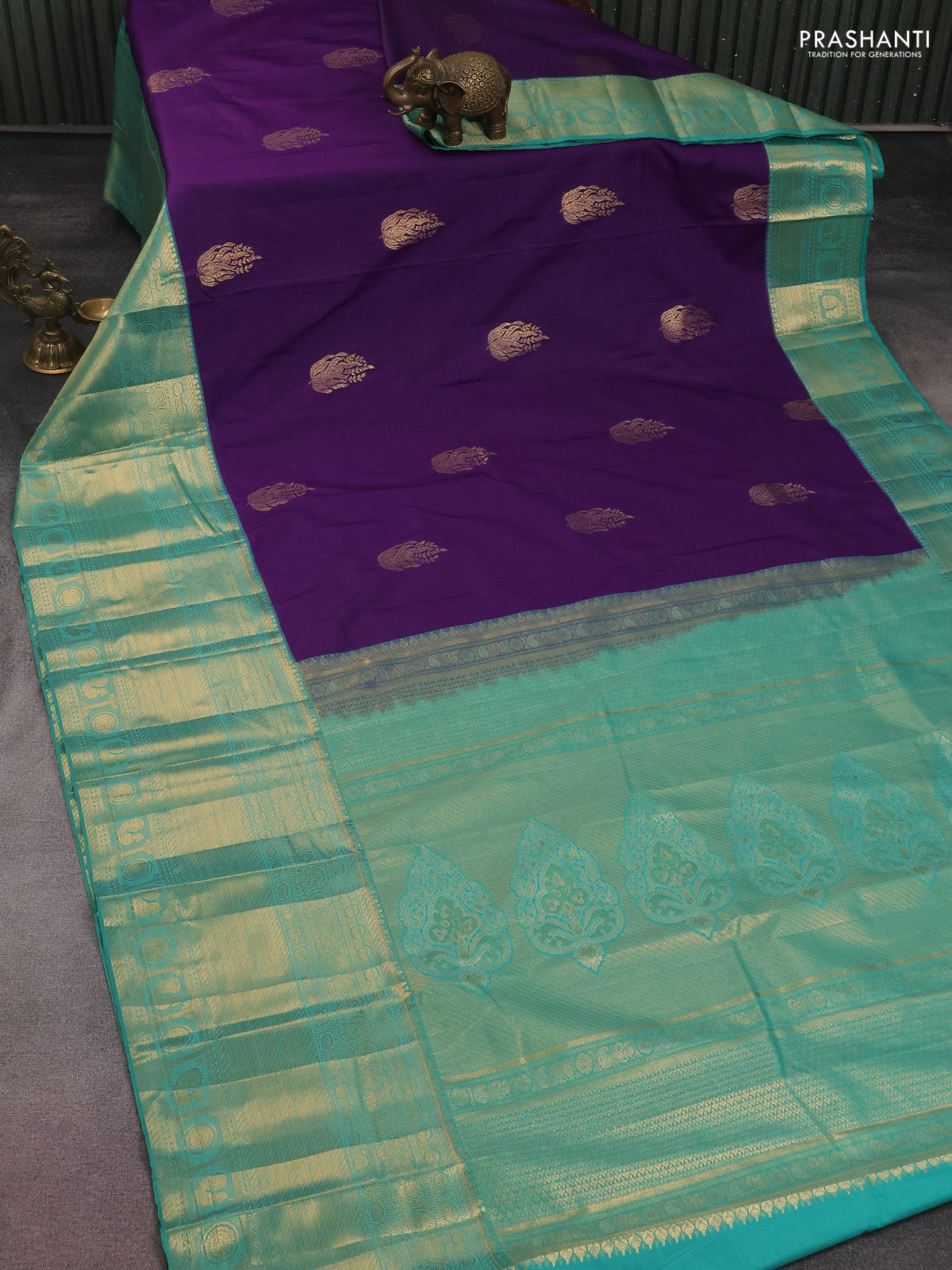 Bangalori silk saree violet and teal green with zari woven buttas and long zari woven border and Butta style