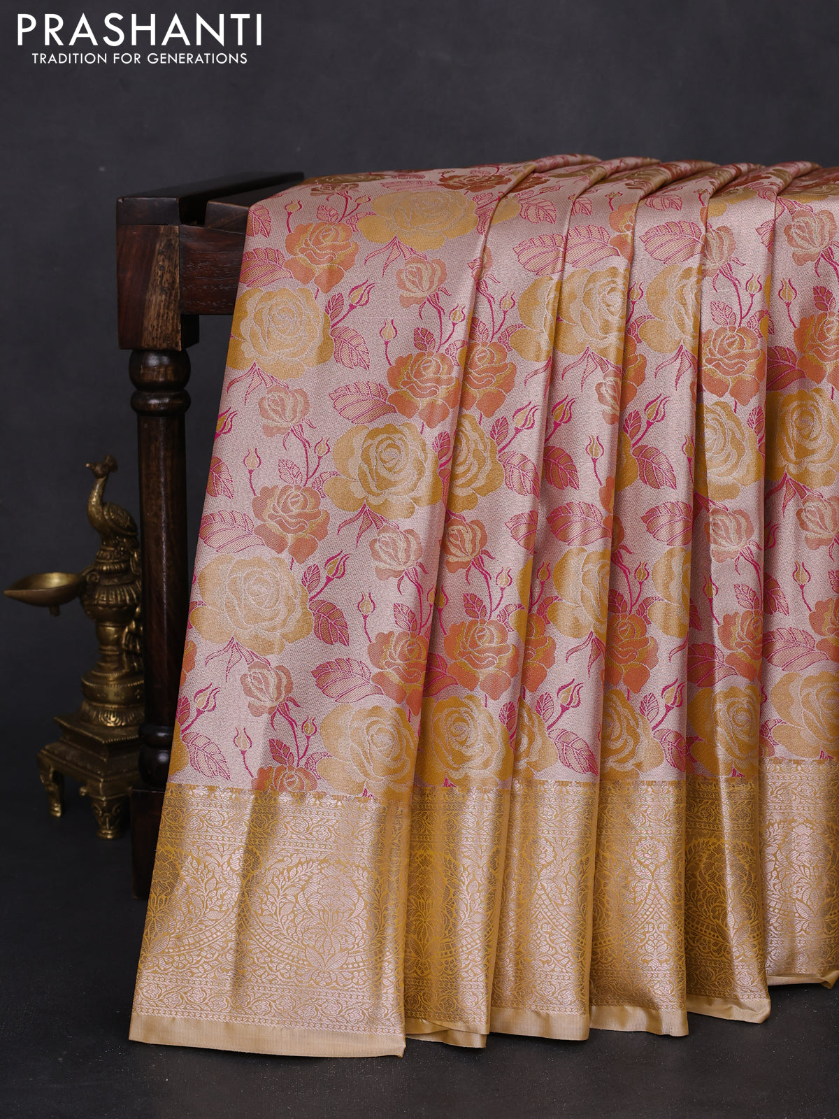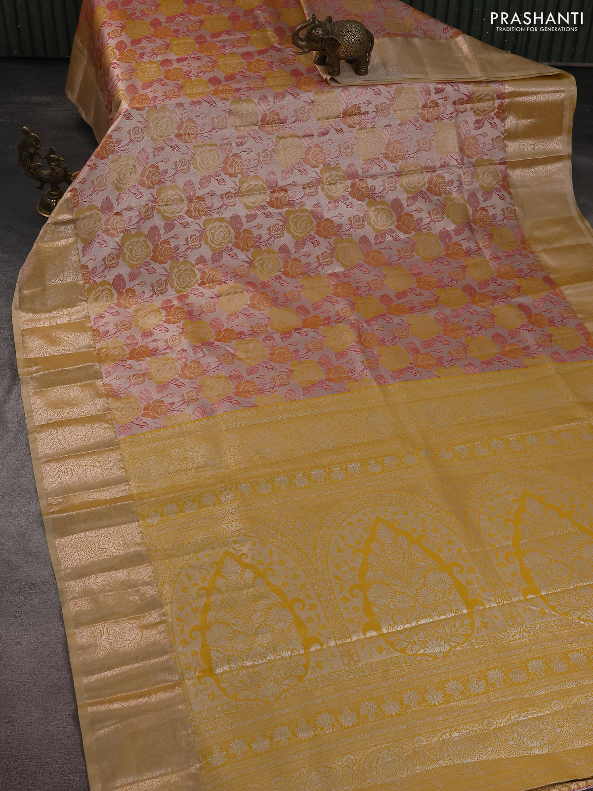 Bangalori tissue silk saree beige and mustard yellow with zari woven floral design brocade pattern and zari woven border