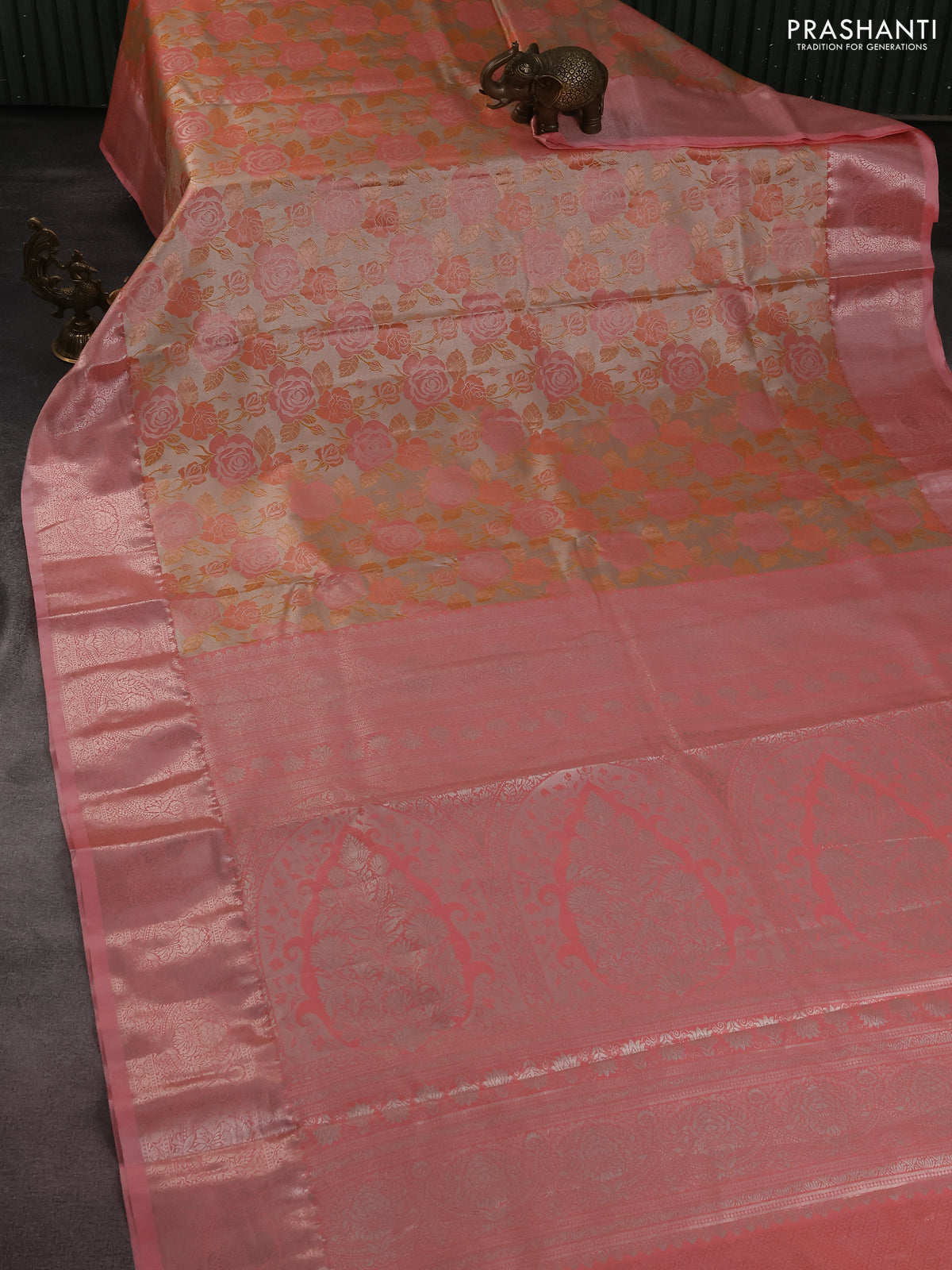 Bangalori tissue silk saree beige and peach pink with zari woven floral design brocade pattern and zari woven border