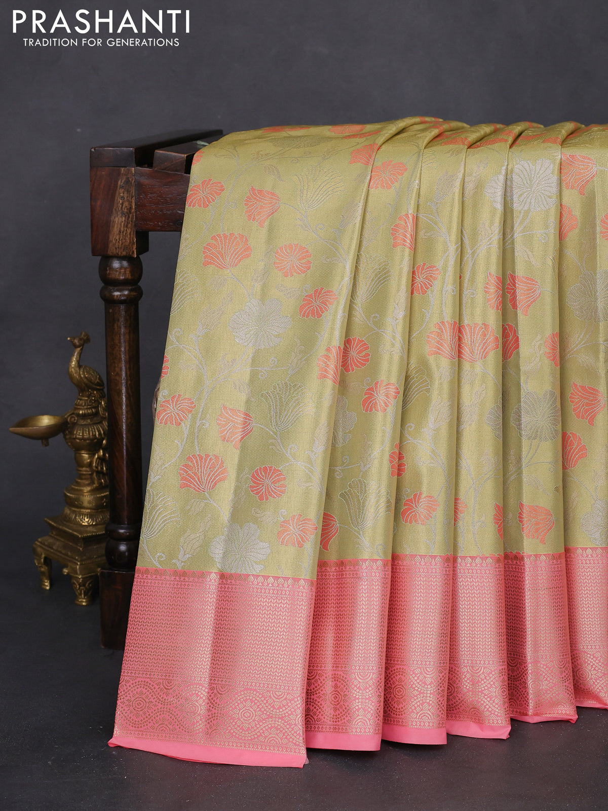 Bangalori tissue silk saree mild pista green and peach pink with zari woven floral design brocade pattern and zari woven border