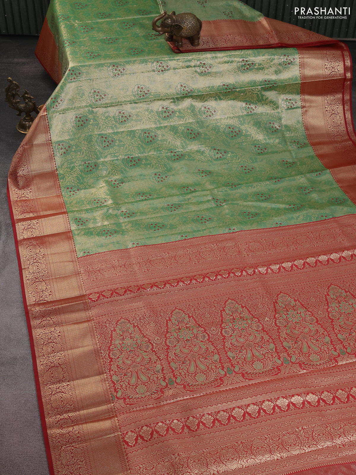 Bangalori tissue silk saree teal green and maroon with zari woven brocade weaves and zari woven border