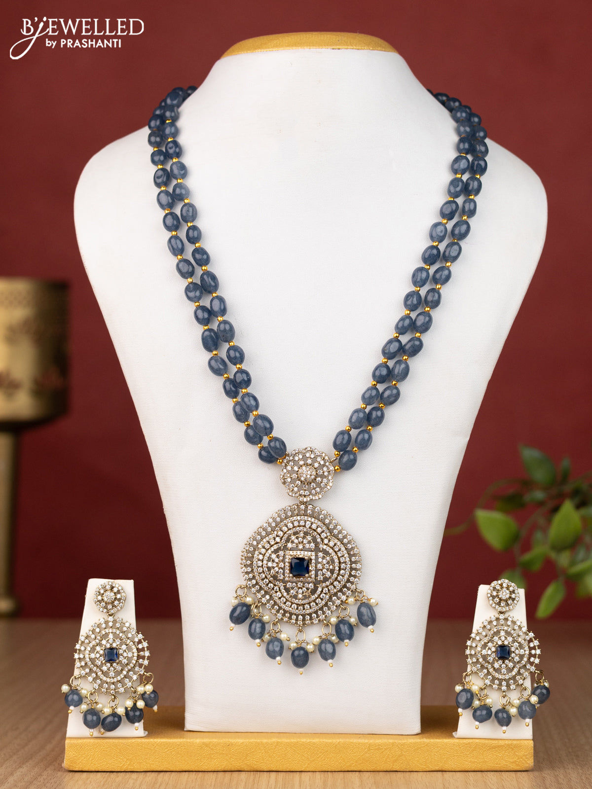 Beaded blue necklace with sapphire & cz stones and pearl & beads hanging in victorian finish