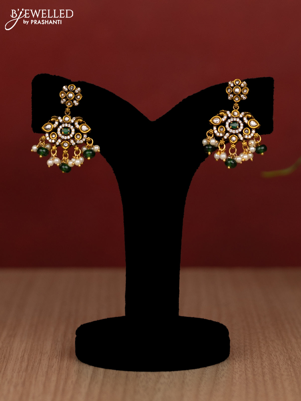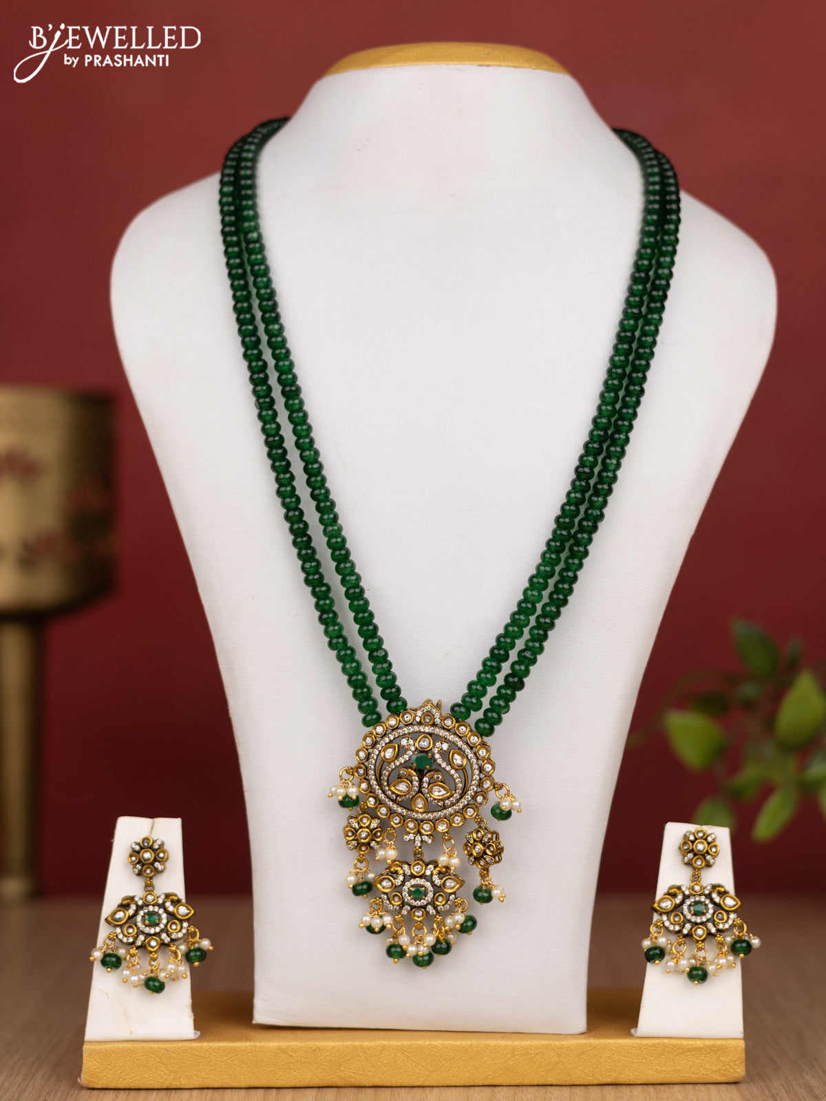 Beaded double layer green haram with kundan & cz stones and pearl & beads hanging in victorian finish
