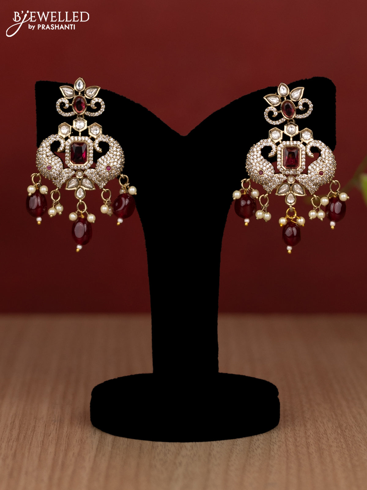 Beaded double layer maroon haram elephant design with kundan & cz stones and pearl & beads hanging in victorian finish