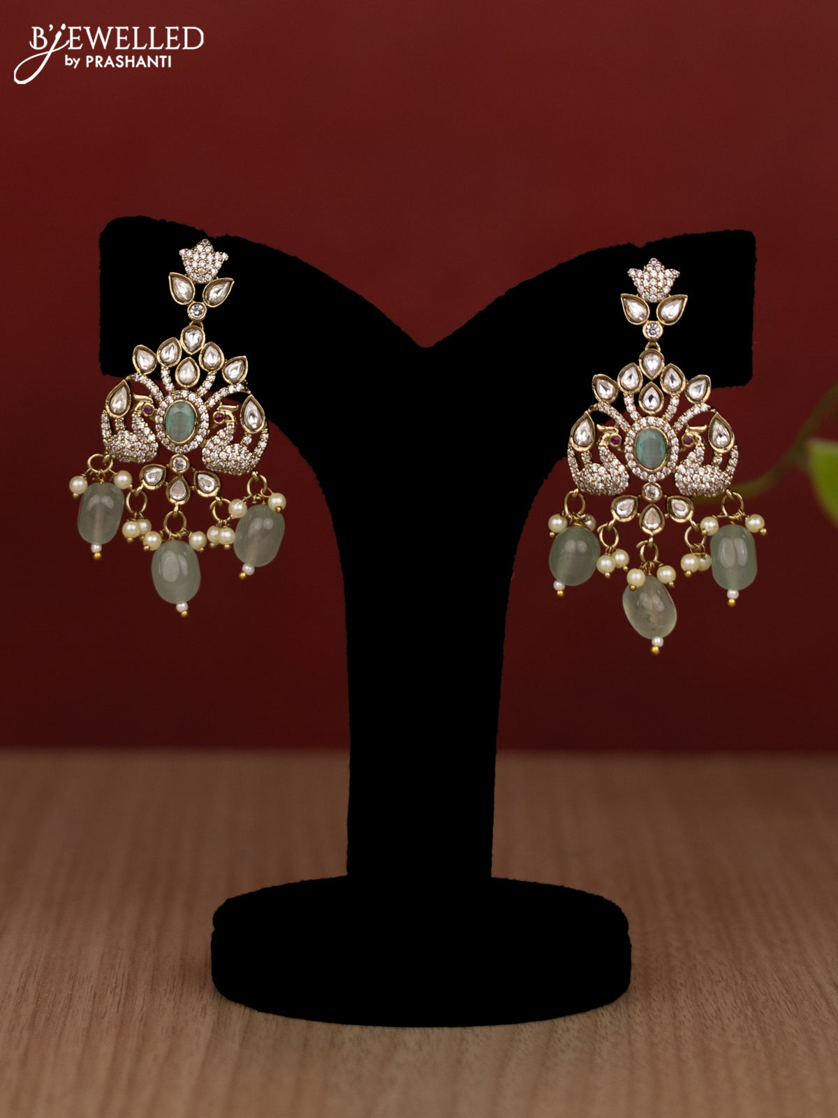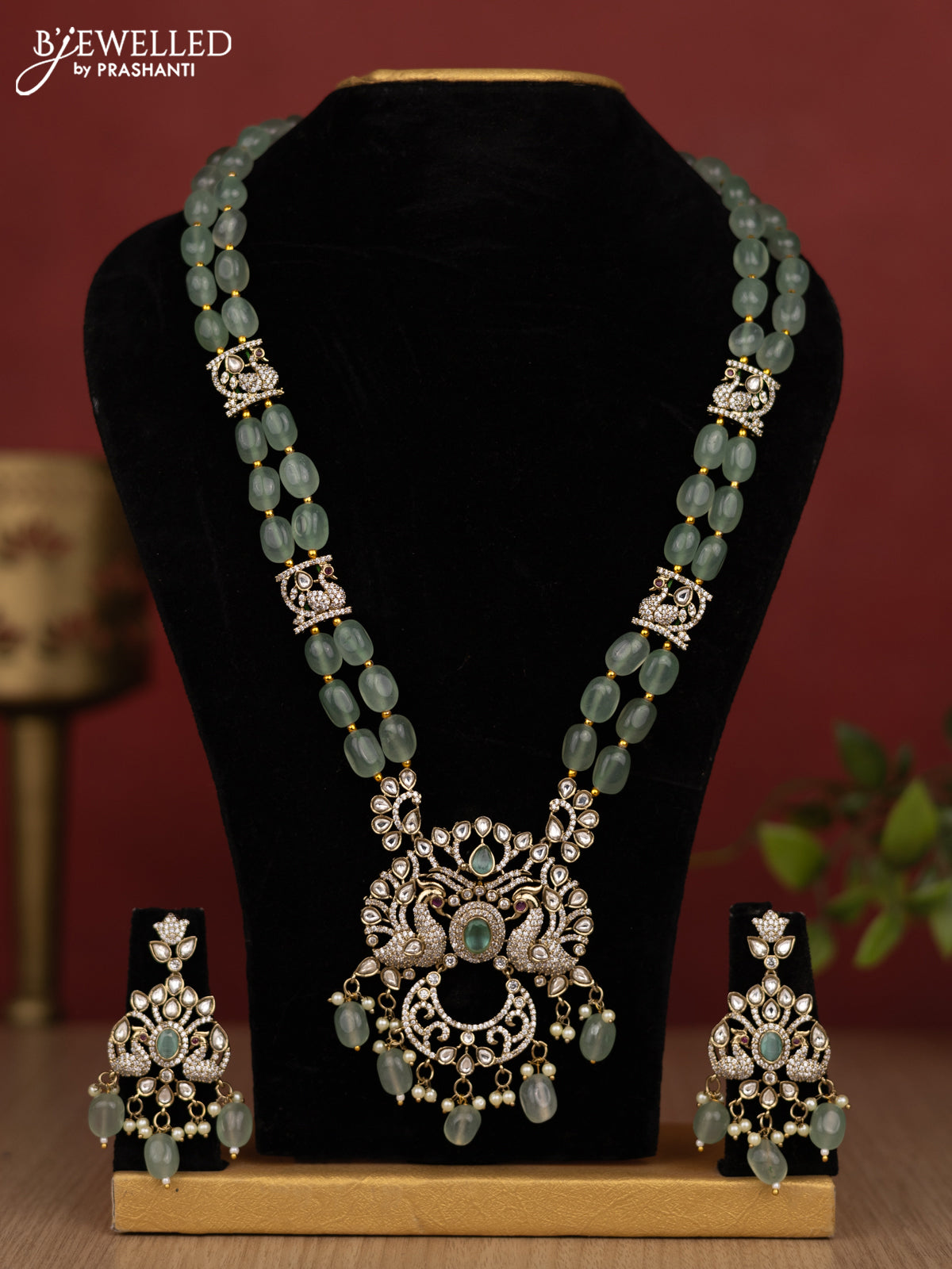 Beaded double layer mint green haram peacock design with kundan & cz stones and pearl & beads hanging in victorian finish