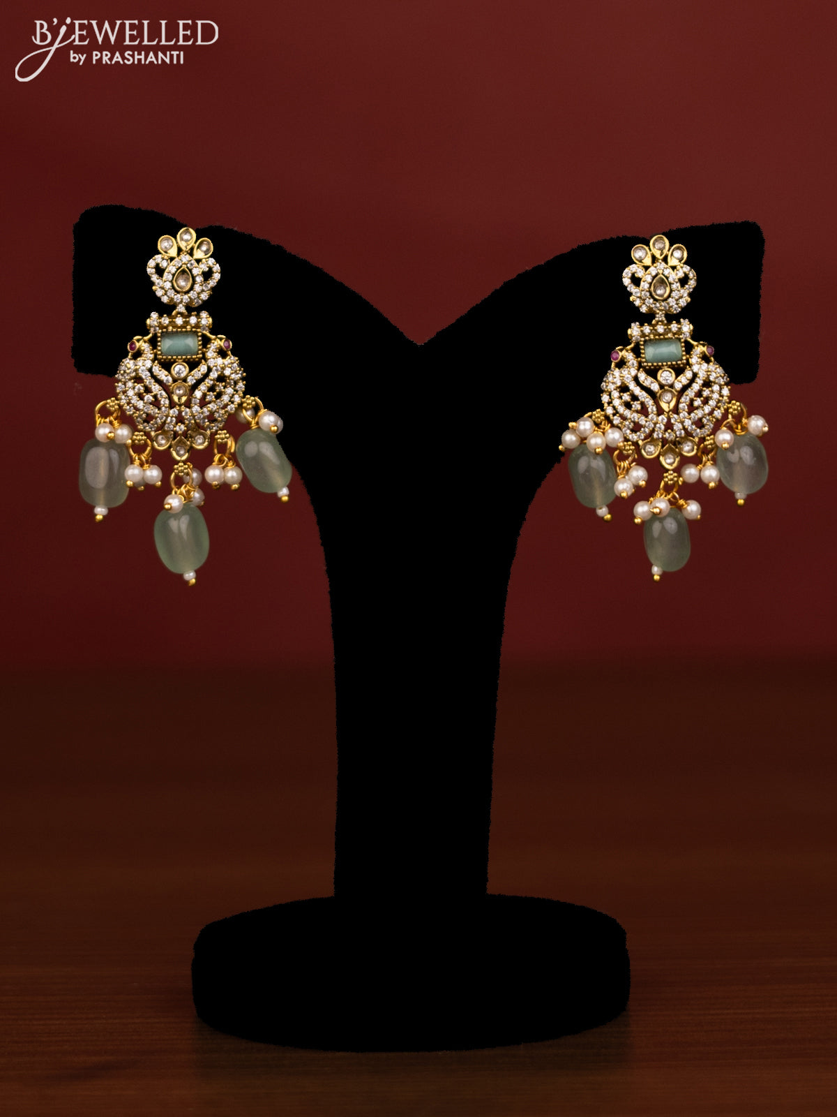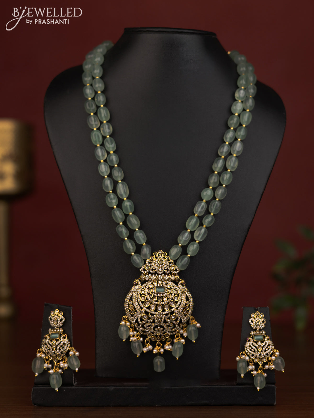 Beaded double layer mint green necklace peacock pendant with ruby & cz stones and beads hanging in victorian finish