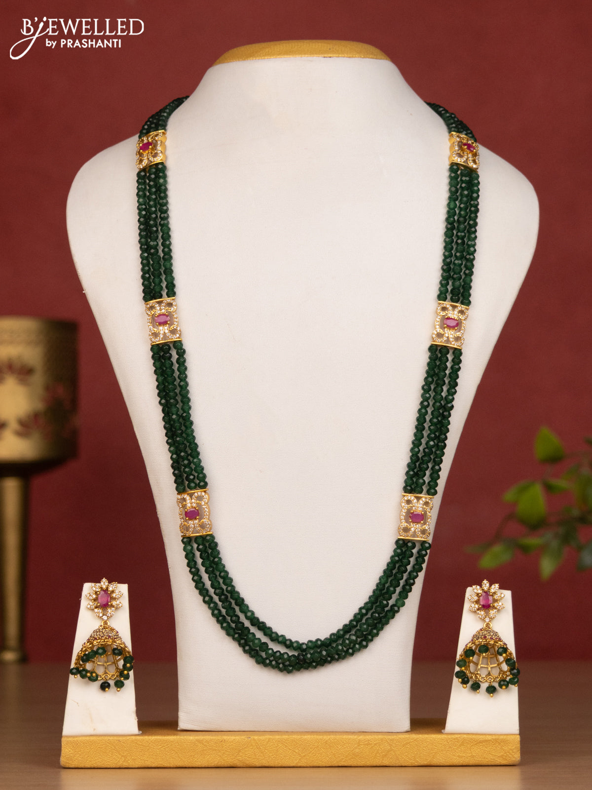 Beaded green haaram with lakshmi side pendant and ruby & cz stones