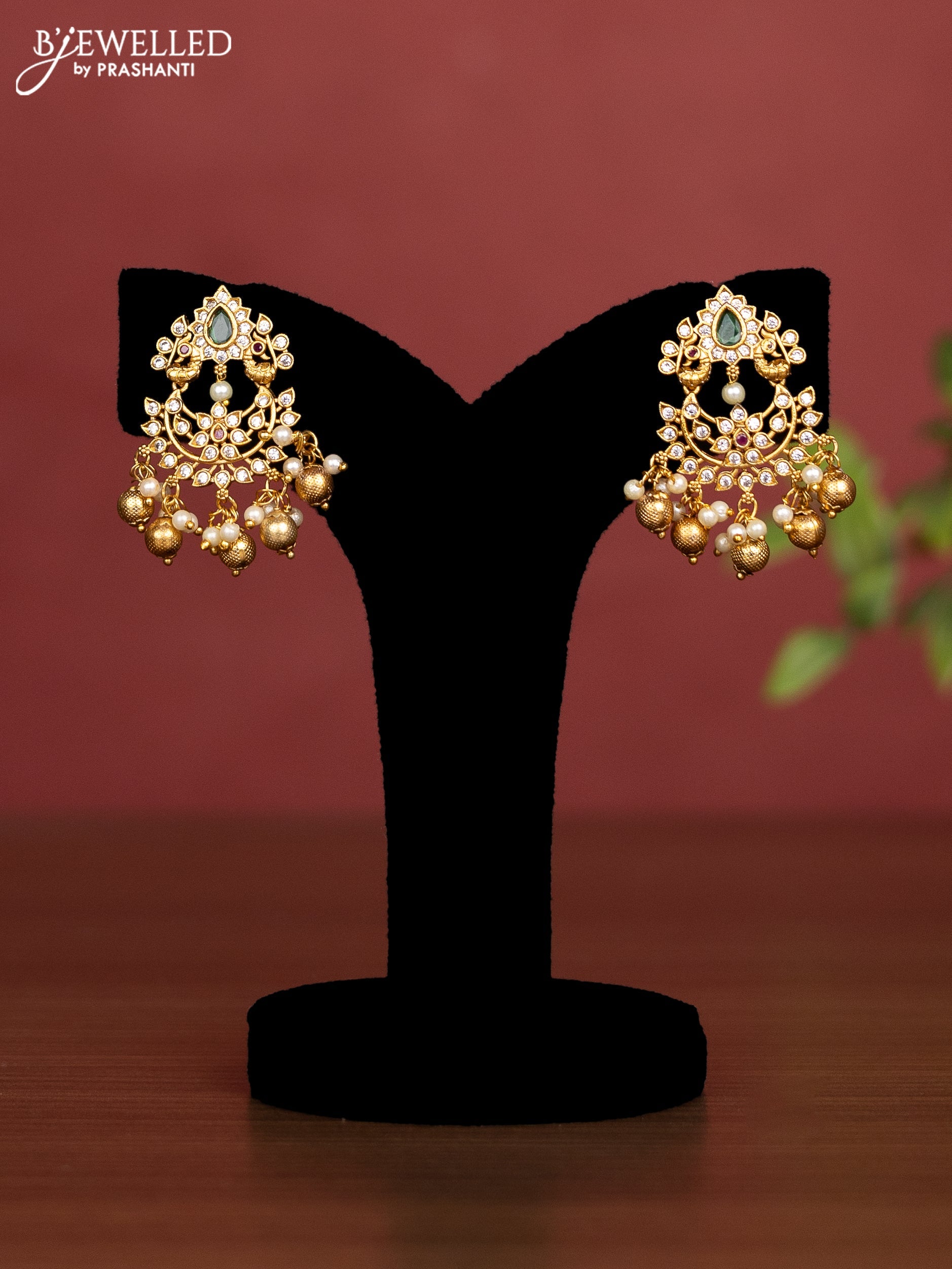 Beaded light brown necklace peacock pendant with kemp & cz stones and golden beads hangings