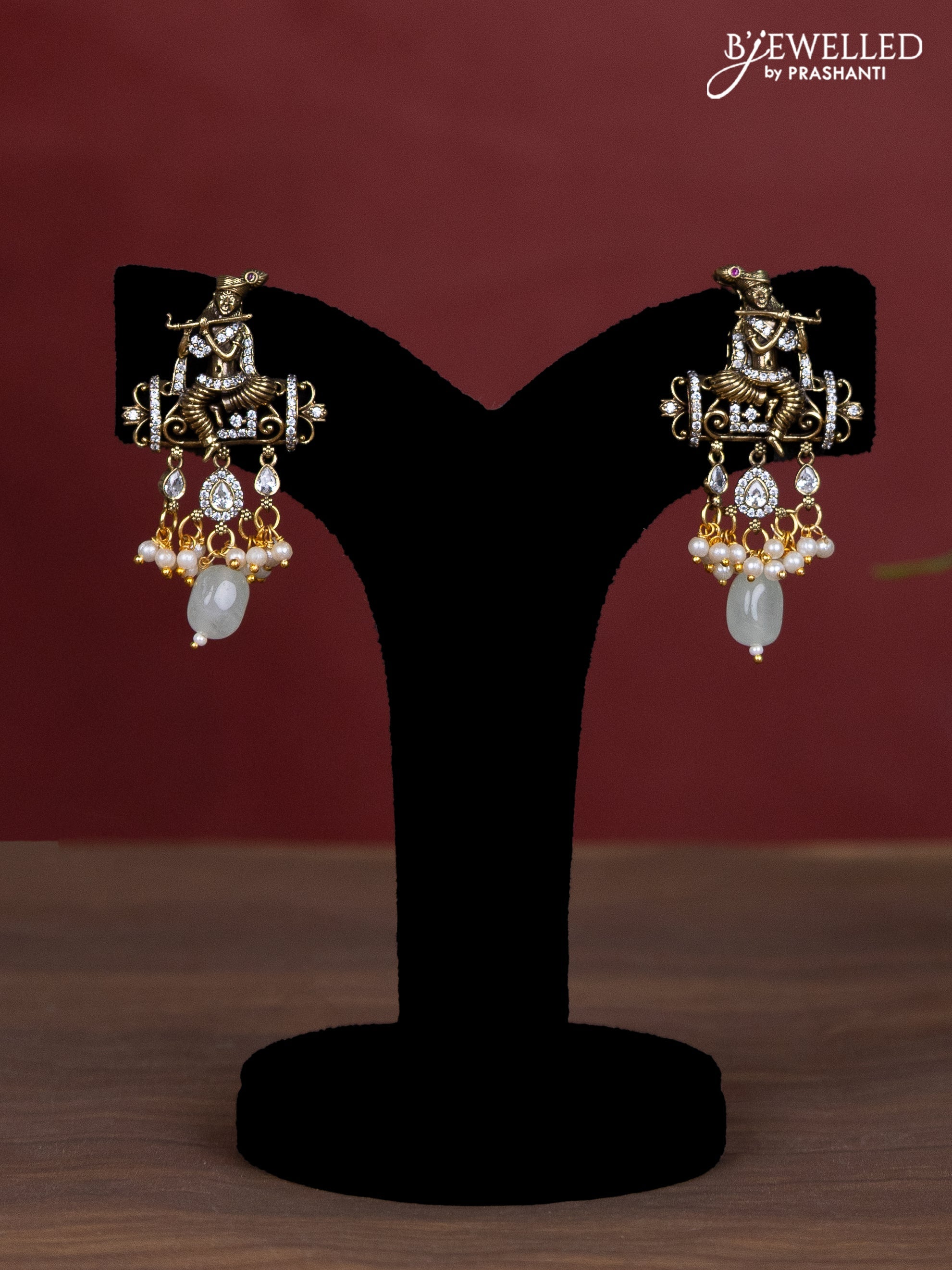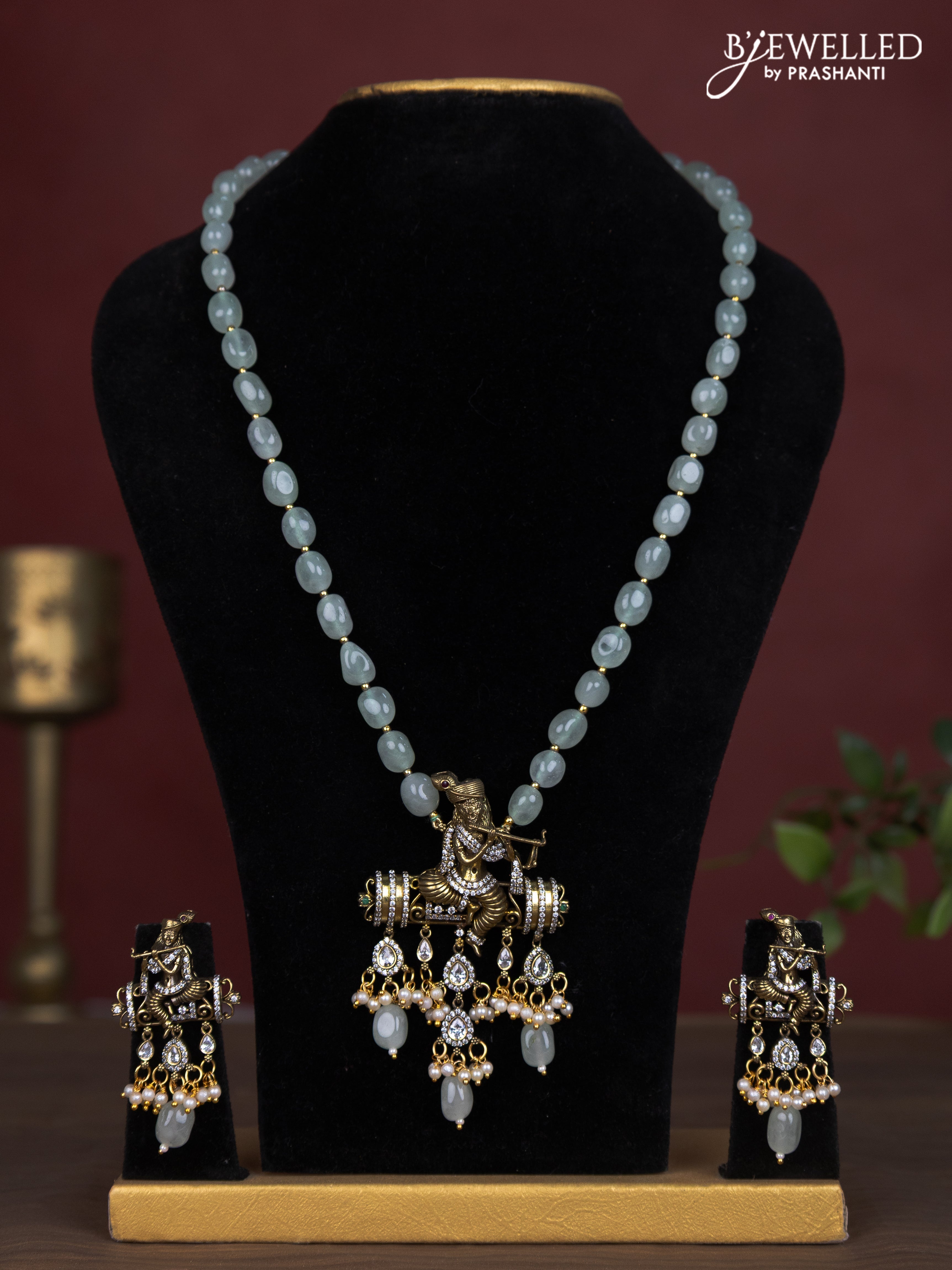 Beaded mint green necklace krishna pendant with kemp & cz stones and pearl & beads hanging in victorian finish